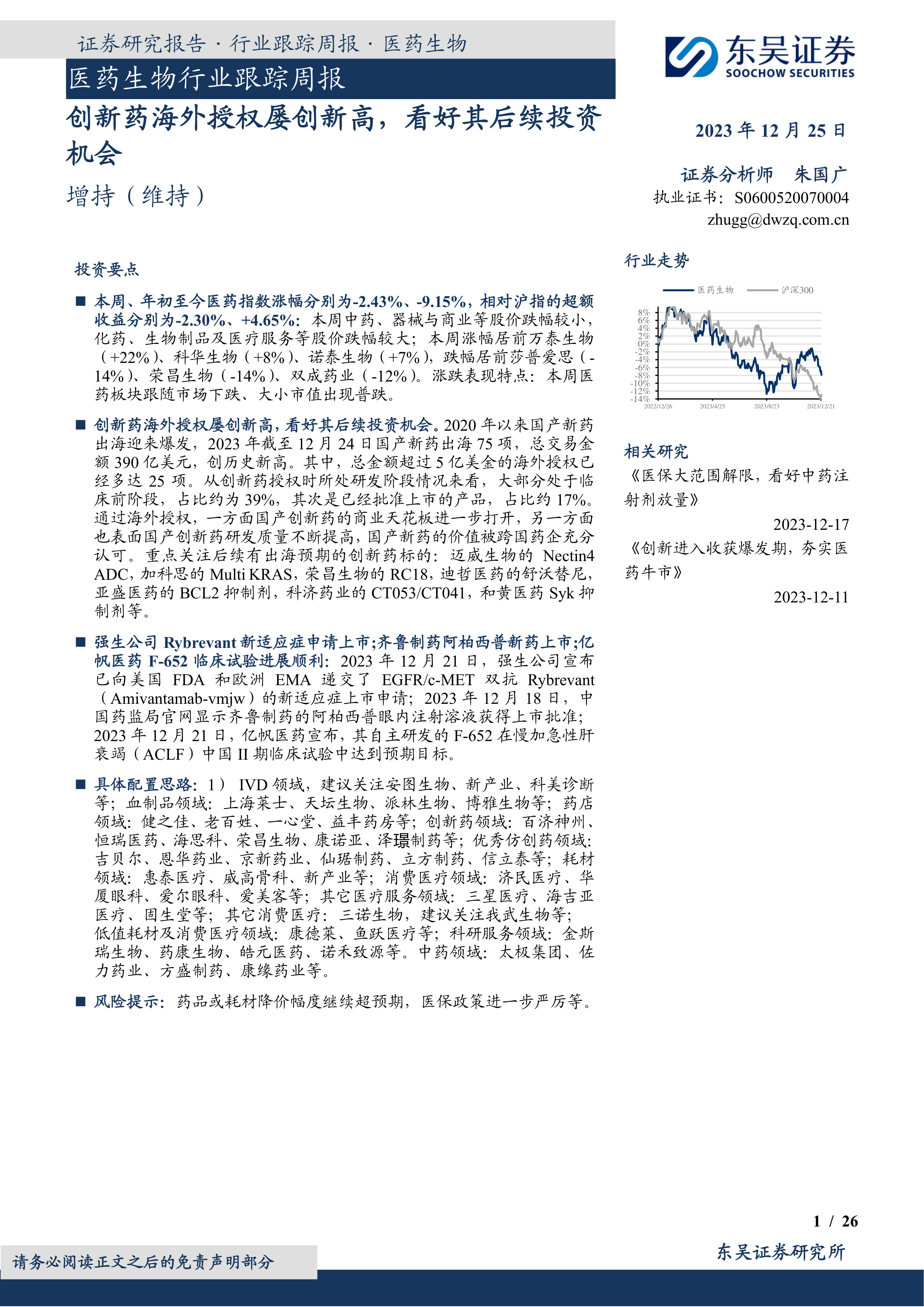 医药生物行业跟踪周报:创新药海外授权屡创新高,看好其后续投资机会