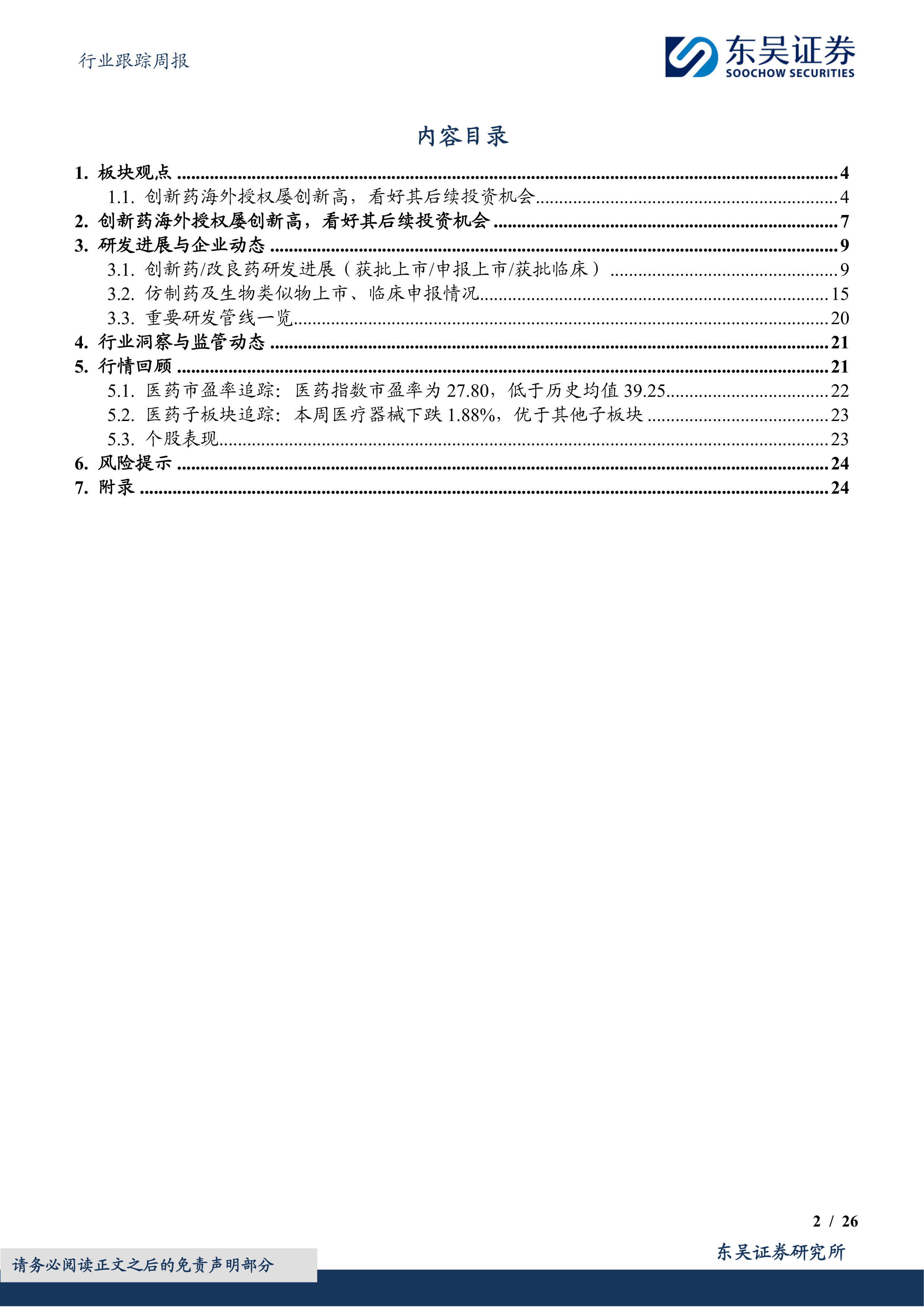 报告的核心观点是,尽管本周医药生物板块出现下跌,但创新药海外授权的积极进展为行业带来了新的增长动力。报告强调了创新药出海的爆发式增长,以及由此带来的商业价值提升和研发质量的提高。同时,报告也指出,在市场调整中,应关注基本面扎实、2024年有催化剂的创新药标的。
