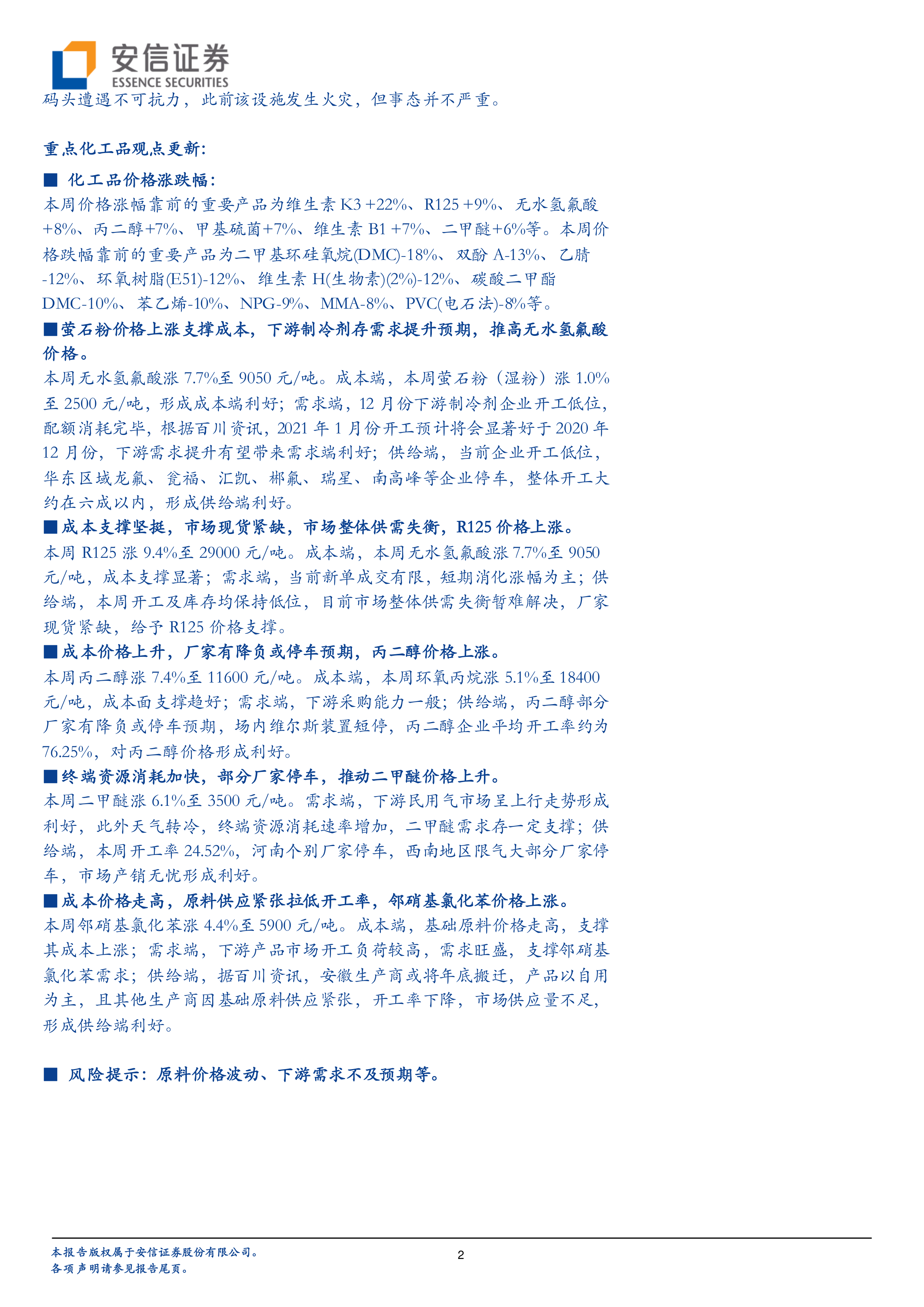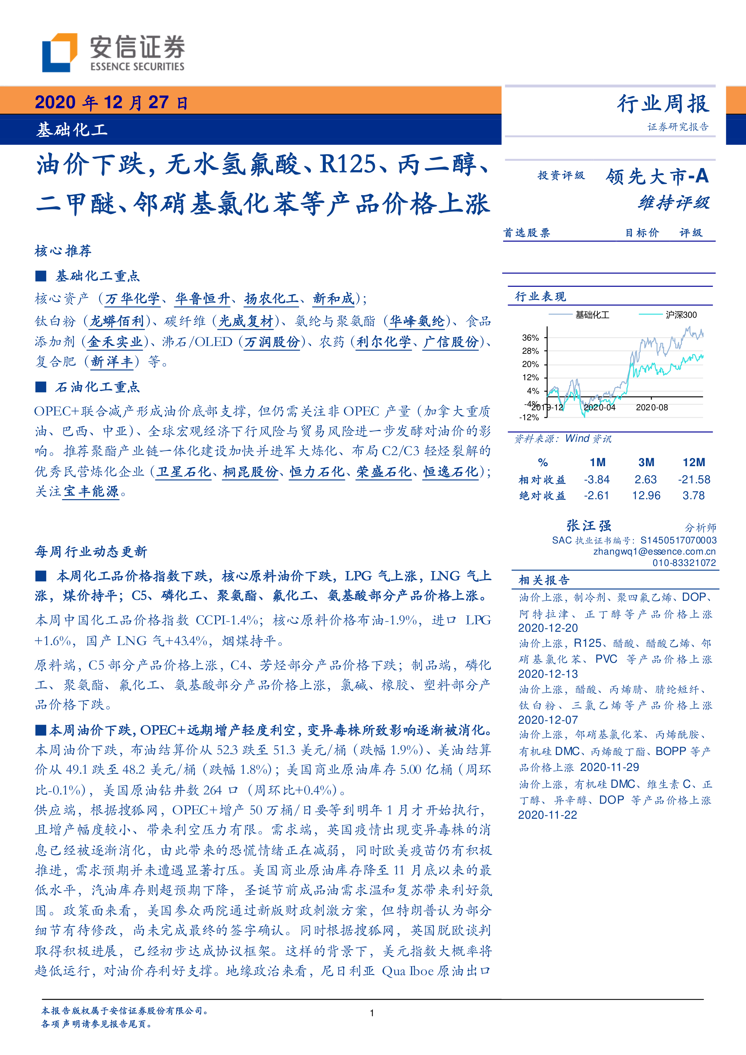 本周基础化工行业呈现油价下跌与部分化工品价格上涨并存的局面。 报告重点分析了无水氢氟酸、R125、丙二醇、二甲醚和邻硝基氯化苯等产品的价格变动,并指出供需关系、成本端和宏观因素是影响价格的主要因素。 报告维持对基础化工行业的“领先大市-A”评级,并推荐关注核心资产和石油化工重点。 投资者应关注原料价格波动、下游需求不及预期等风险。