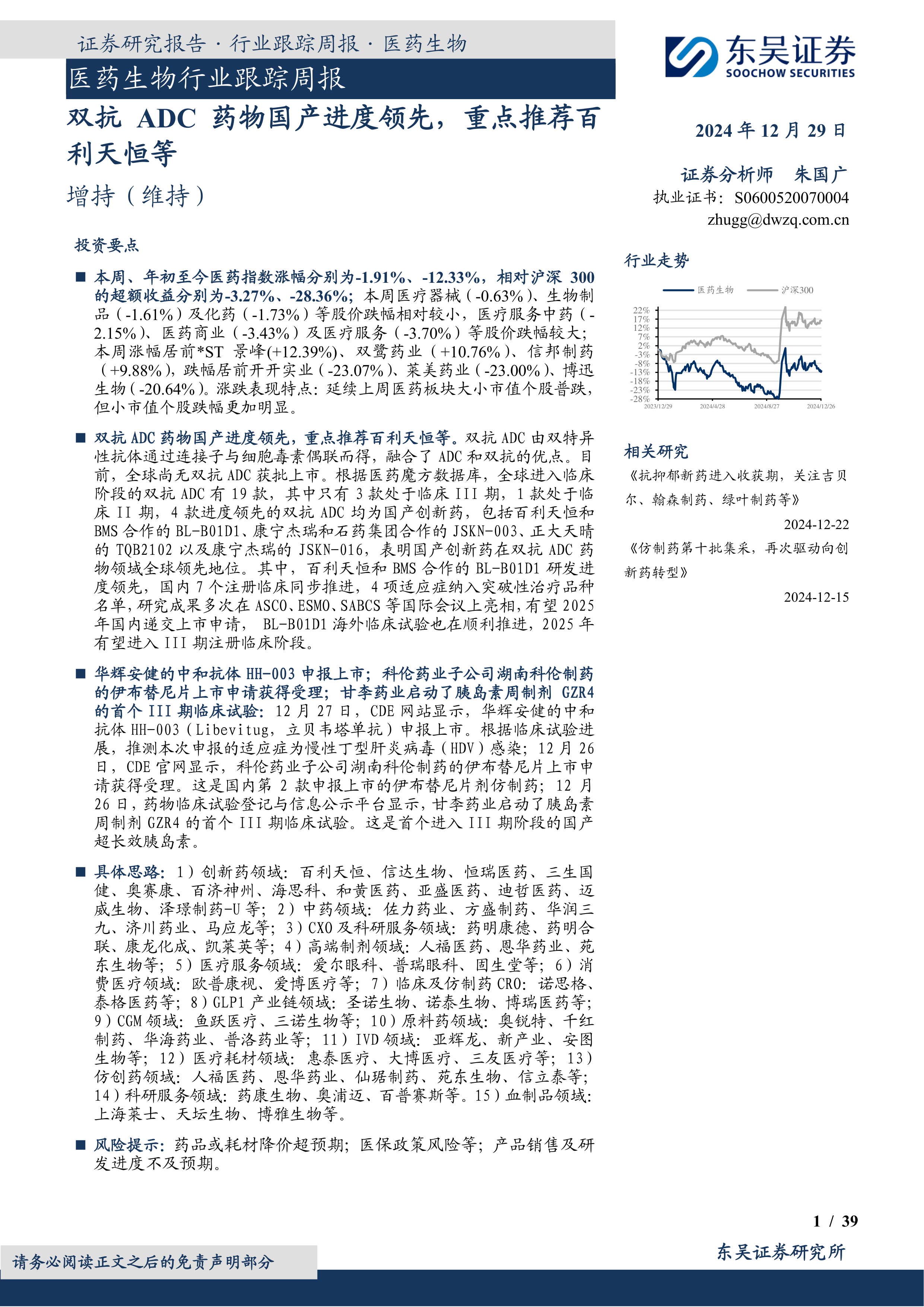 本周医药生物板块整体表现不佳,但双抗 ADC 药物领域国产创新药展现出领先优势,百利天恒等企业值得重点关注。 报告同时提示了行业面临的风险,包括药品降价、医保政策变化以及研发和销售进度不及预期等。