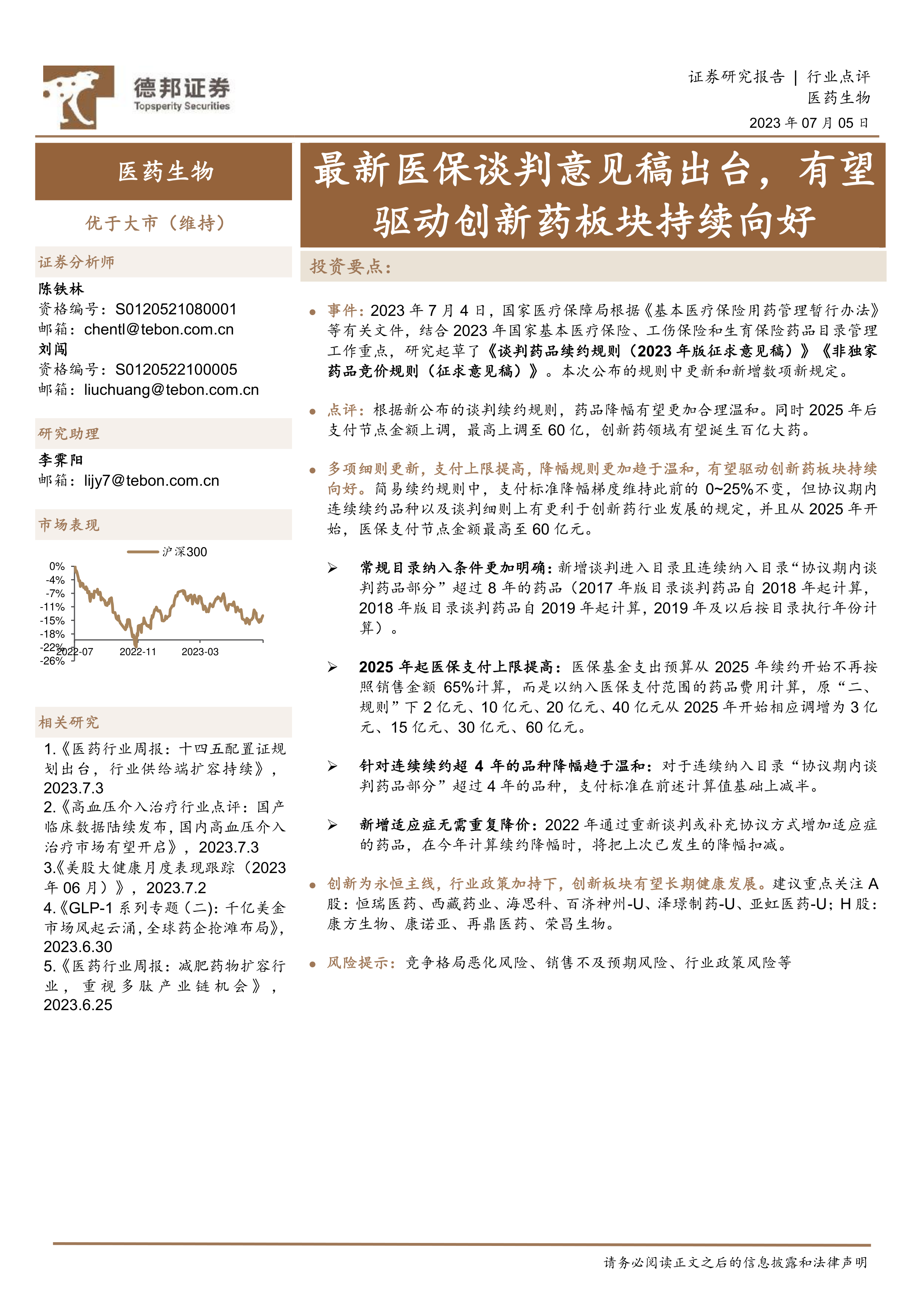 本报告深入分析了2023年医保谈判续约新规,认为新规对创新药板块构成利好,有望驱动其持续向好。报告详细解读了新规的各项细则,并提示了行业面临的风险。 建议投资者关注创新药领域,并密切关注相关政策变化。