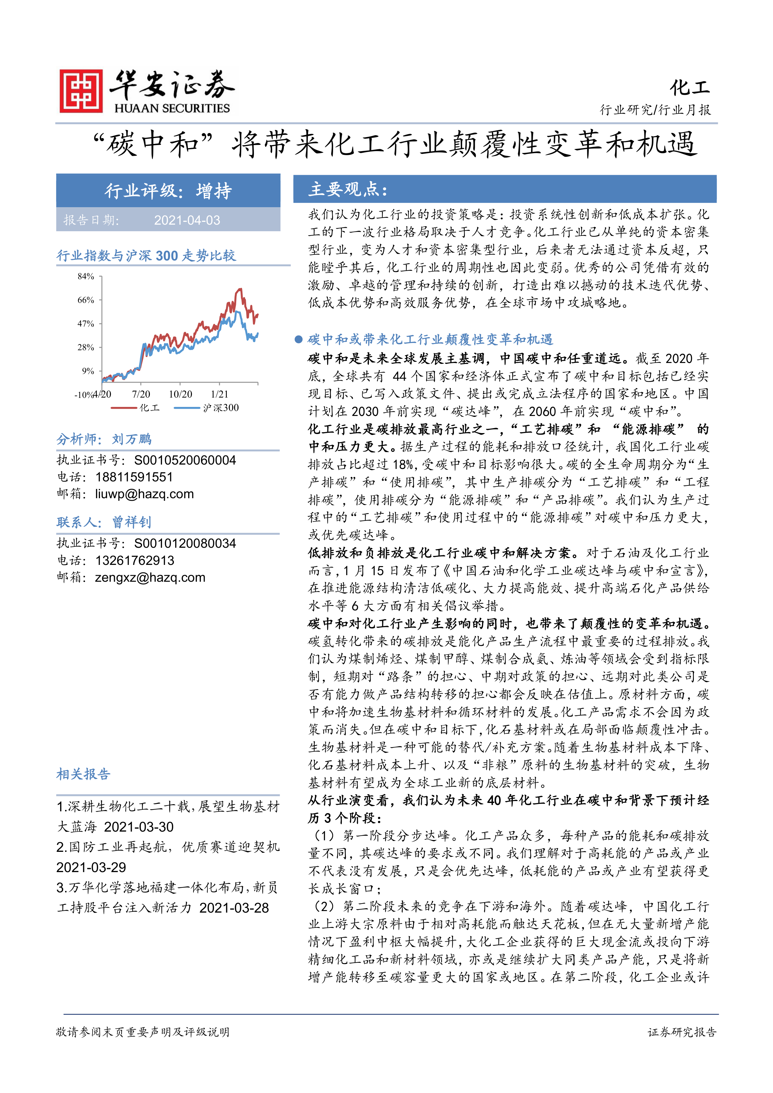 本报告深入分析了碳中和背景下化工行业的变革与机遇,并对重点公司进行了跟踪。 报告认为,碳中和将对化工行业产生深远影响,生物基材料等领域将迎来发展机遇。 报告还对行业内重点公司的业绩、项目进展、市场表现等进行了详细分析,为投资者提供了 重要的参考信息。