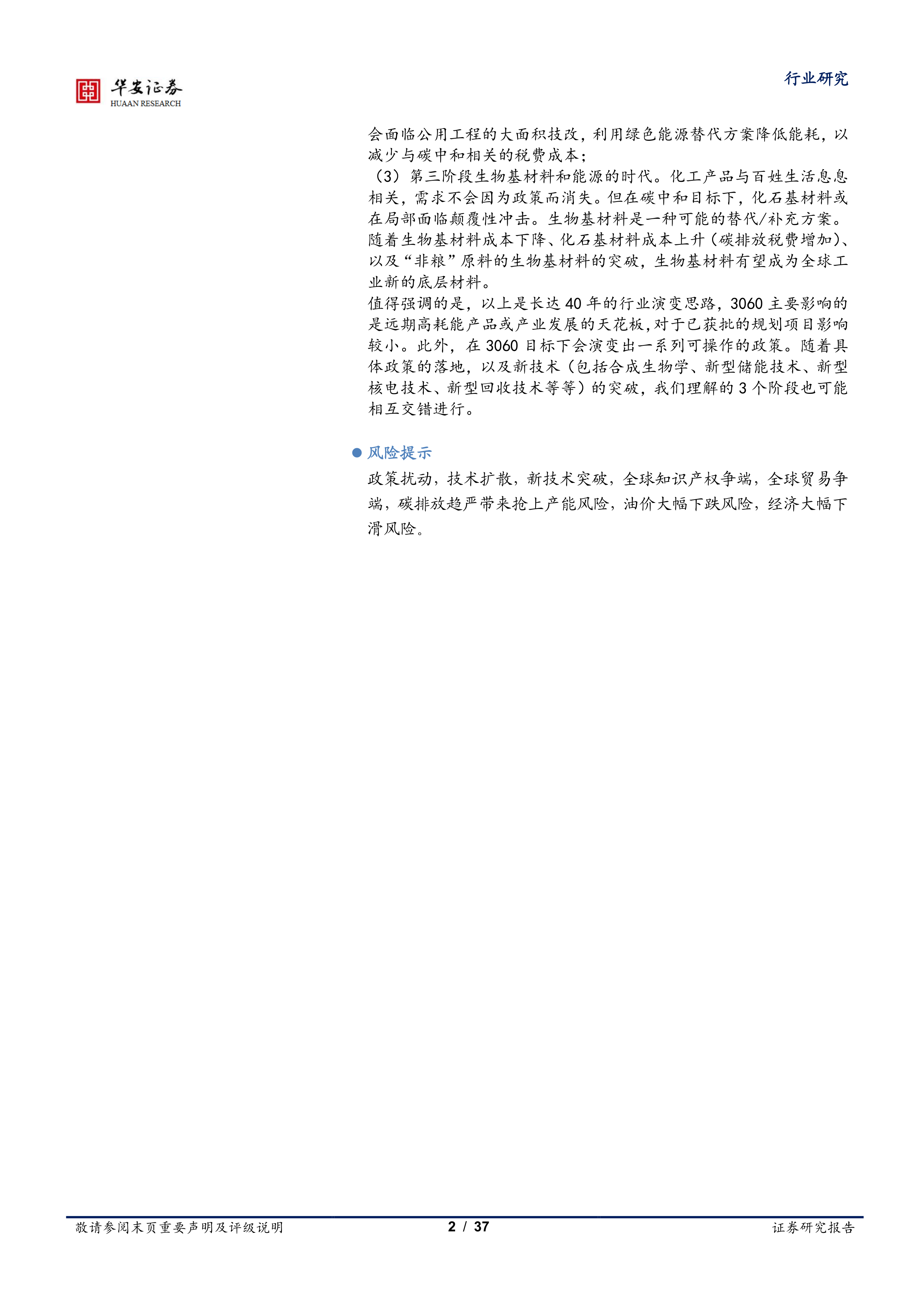 值得强调的是,以上是长达40年的行业演变思路,3060主要影响的是远期高耗能产品或产业发展的天花板,对于已获批的规划项目影响较小。此外,在3060目标下会演变出一系列可操作的政策。随着具体政策的落地,以及新技术(包括合成生物学、新型储能技术、新型核电技术、新型回收技术等等)的突破,我们理解的3个阶段也可能相互交错进行。