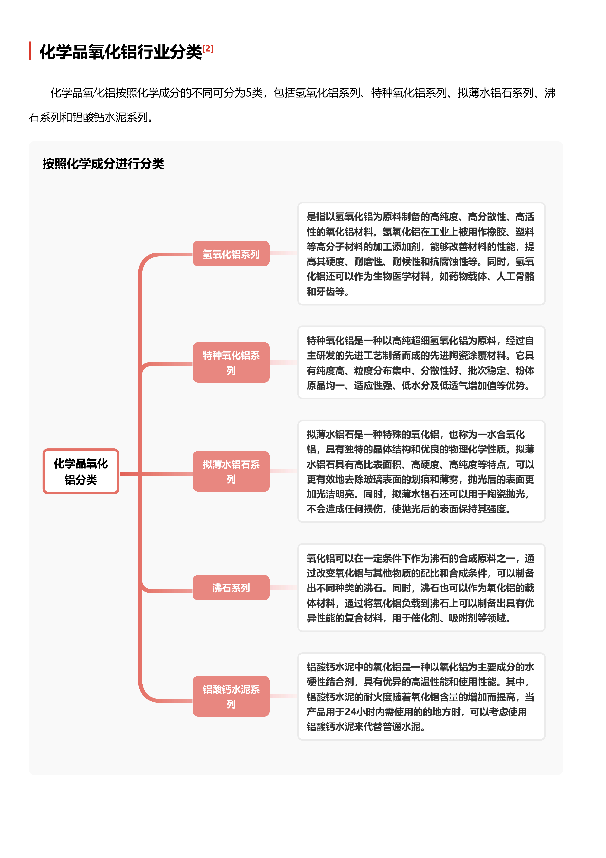 化学品氧化铝行业,是指专门从事生产、研发和供应非治金级氧化铝的企业或机构所组成的行业,也被称非治金级氧化铝,占中国氧化铝总产量的5%。化学品氧化铝按照化学成分的不同可分为5类,包括氢氧化铝系列、特种氧化铝系列、拟薄水铝石系列、沸石系列和铝酸钙水泥系列。受大环境影响,化学品氧化铝价格开始温和回升推动市场规模增长。除此之外,先进陶瓷、LED等化学品氧化铝的关键下游领域快速发展,进一步为化学品氧化铝行业打开市场空间