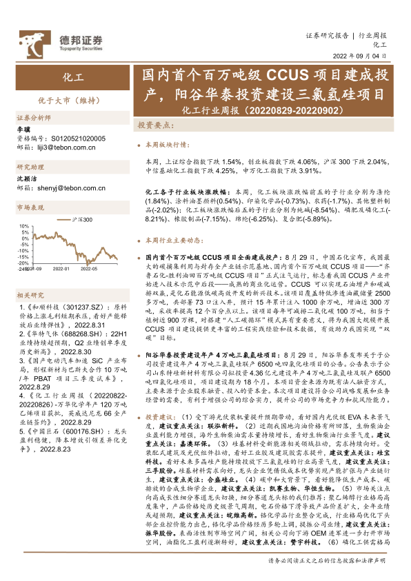 化工行业周报:国内首个百万吨级CCUS项目建成投产,阳谷华泰投资建设三氯氢硅项目