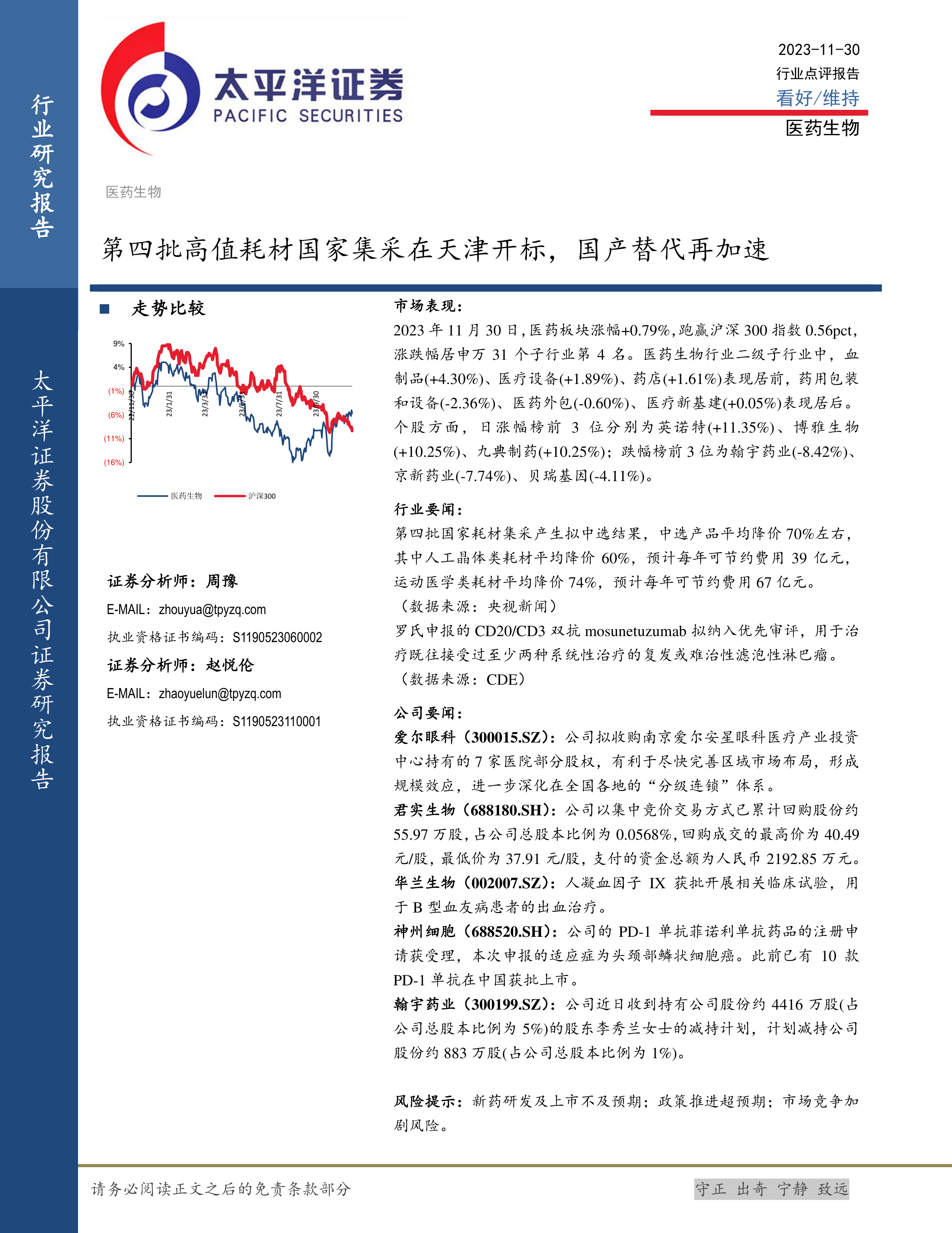 本报告重点分析了2023年11月30日医药生物行业的市场表现,指出在国家高值耗材集采的推动下,国产替代加速,行业整体表现积极。报告还分析了细分板块和个股的涨跌情况,并关注了行业内重要公司动态。最后,报告提示了新药研发、政策推进和市场竞争等方面的风险。