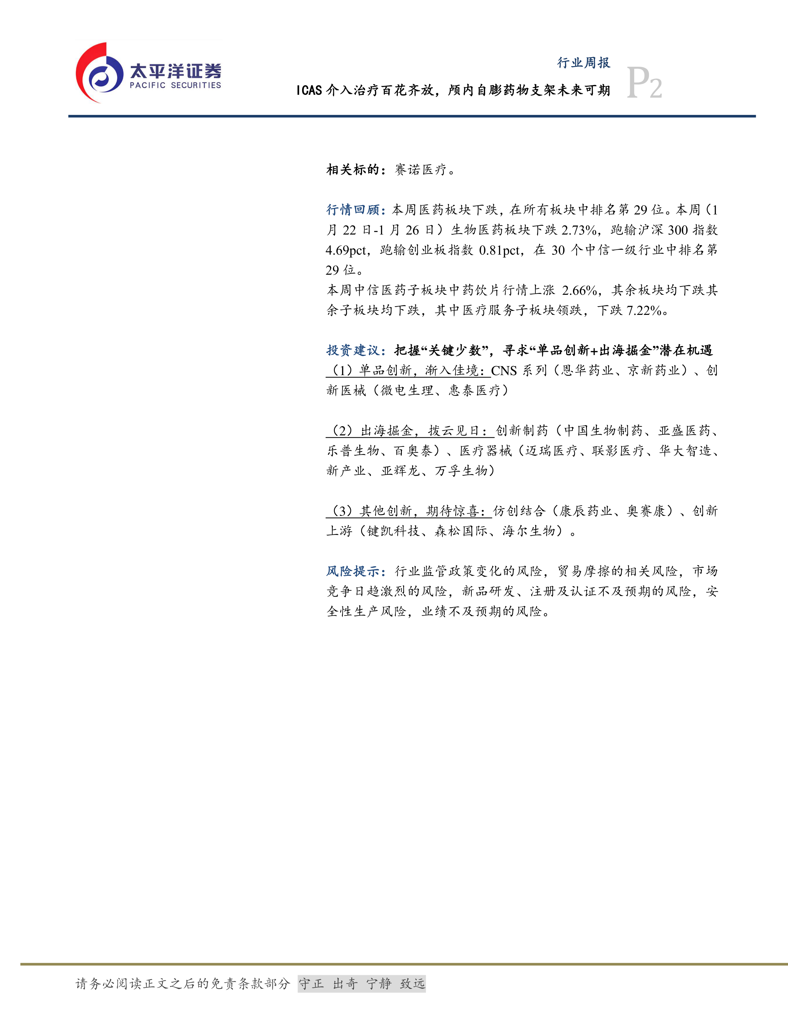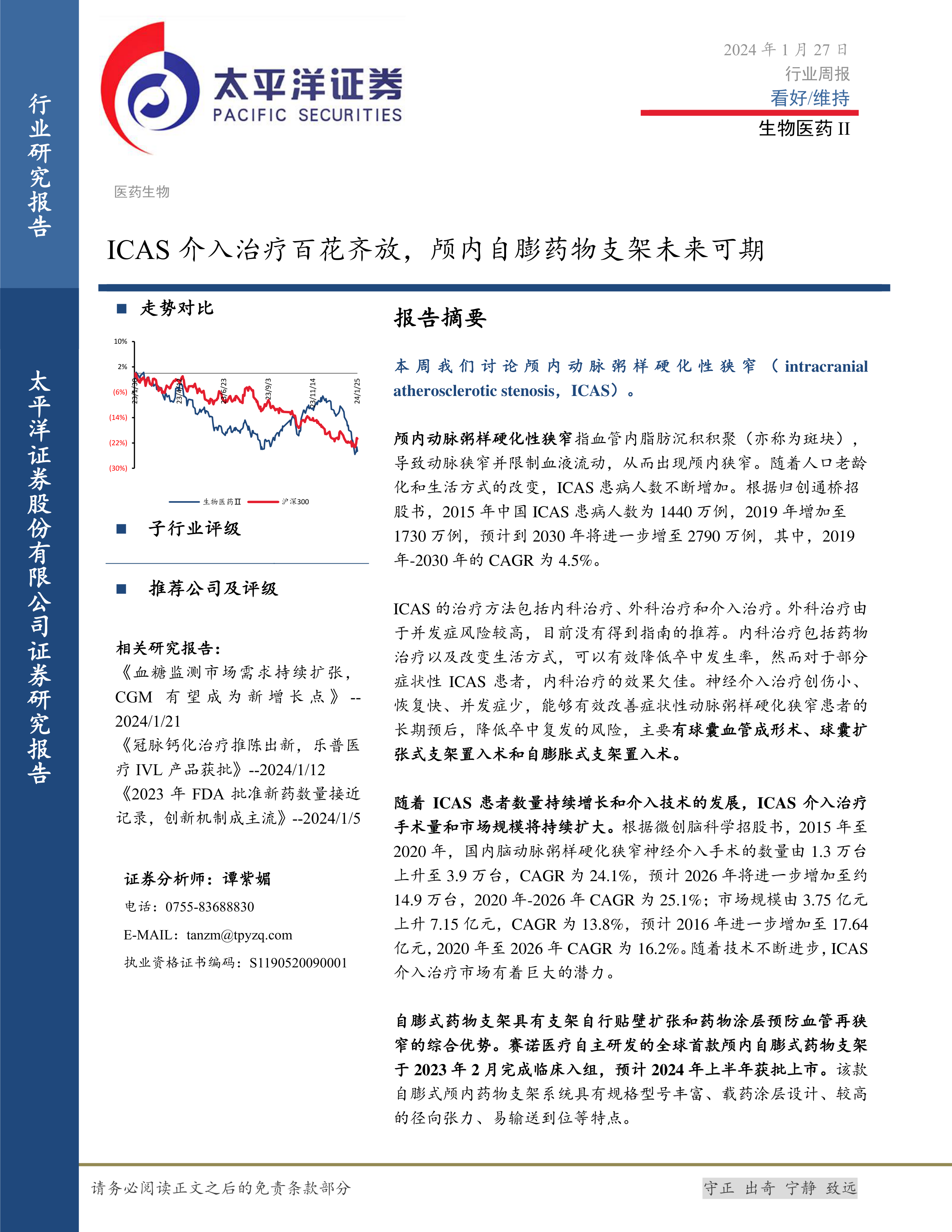 本报告的核心观点聚焦于生物医药行业,特别是ICAS(颅内动脉粥样硬化性狭窄)介入治疗领域。报告指出,ICAS患病人数持续增长,推动介入治疗手术量和市场规模扩大,自膨式药物支架因其优势有望成为首选方案。同时,报告分析了生物医药板块的整体表现,并提出了“单品创新+出海掘金+院内刚需”的投资建议,推荐了相关标的。