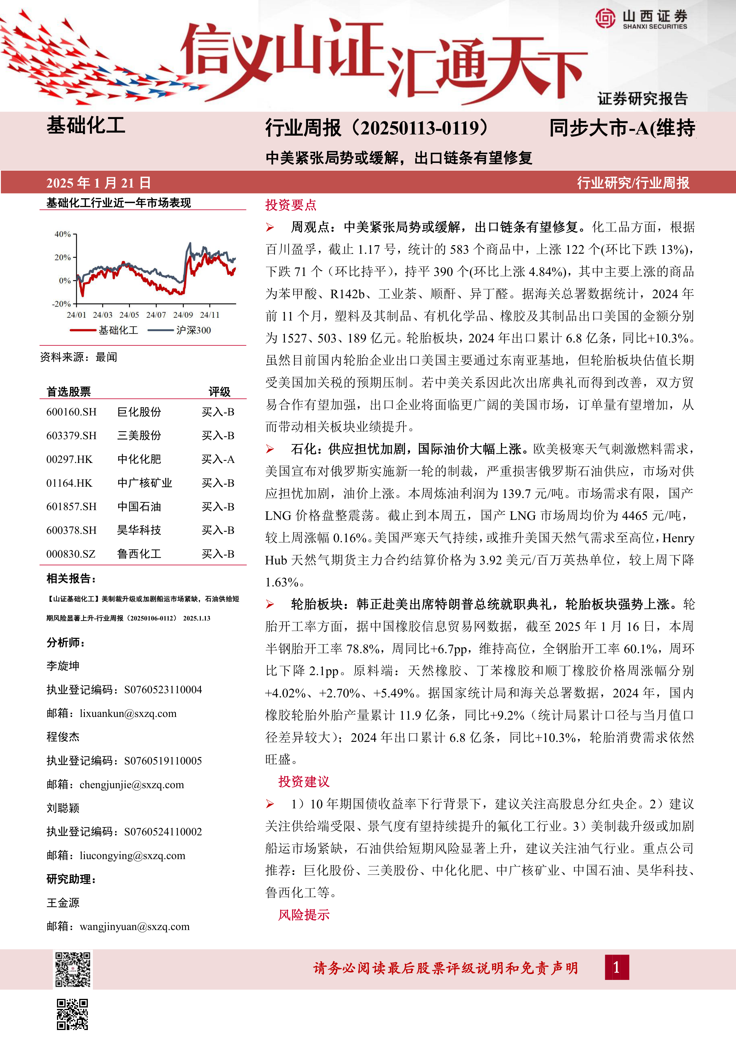 本周报重点分析了基础化工行业,核心观点是中美关系改善预期将利好出口,特别是轮胎板块。报告详细分析了化工品市场、石化板块和轮胎板块的表现,并提供了投资建议和风险提示。报告指出,国际油价上涨、中美关系、开工率等因素对行业有重要影响。 投资者应关注高股息央企、氟化工行业和油气行业,并注意规避原油价格波动、汇率波动、贸易摩擦和行业竞争加剧等风险。