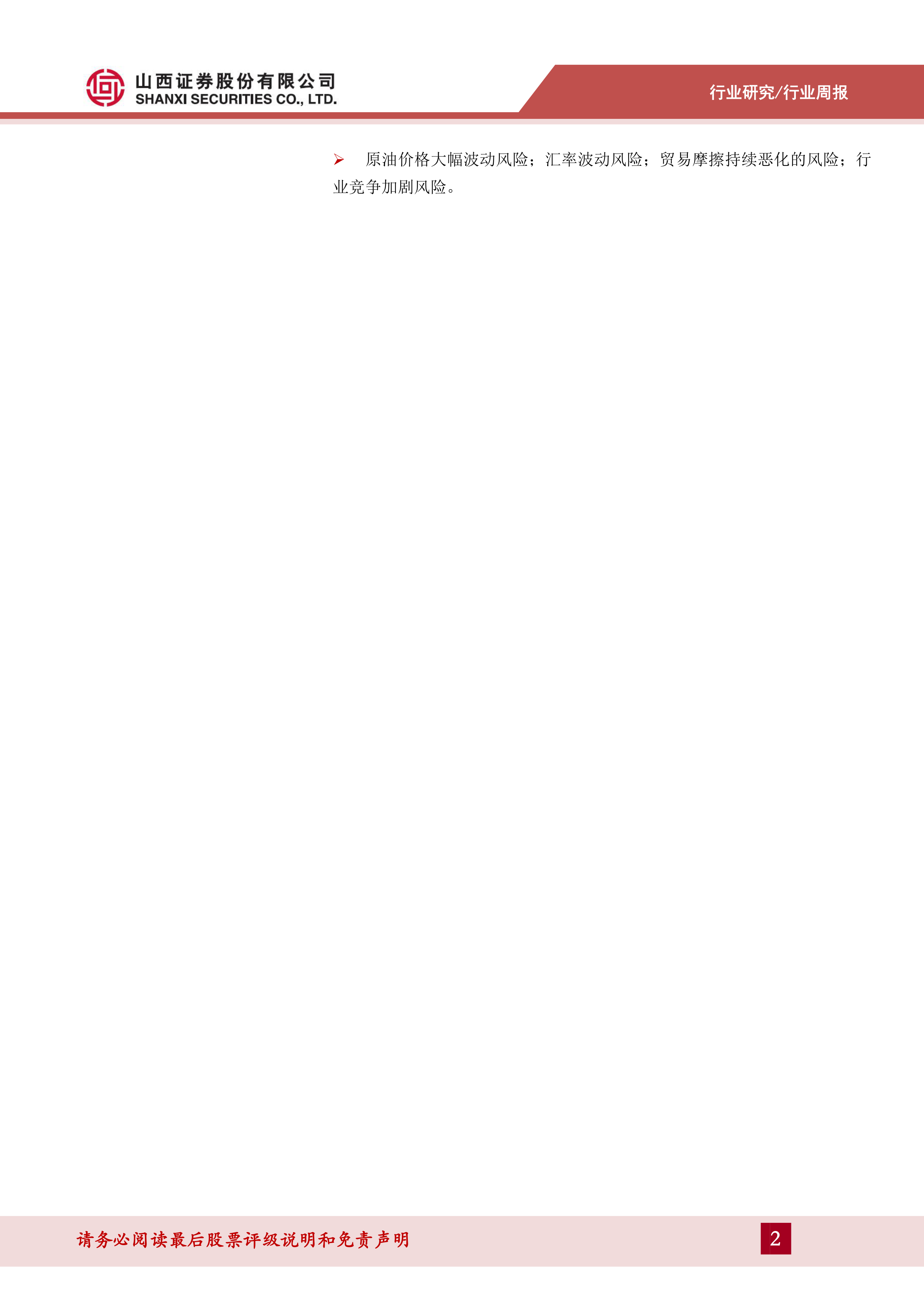 原油价格大幅波动风险;汇率波动风险;贸易摩擦持续恶化的风险;行业竞争加剧风险。