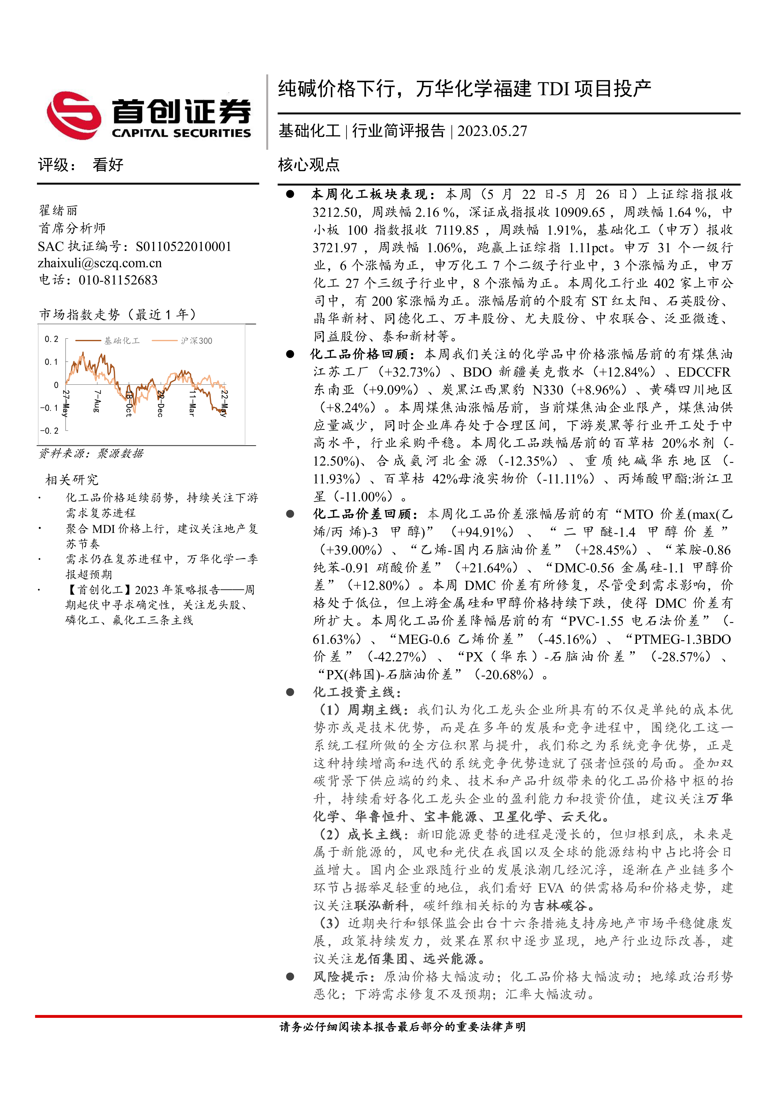 基础化工行业简评报告:纯碱价格下行,万华化学福建TDI项目投产