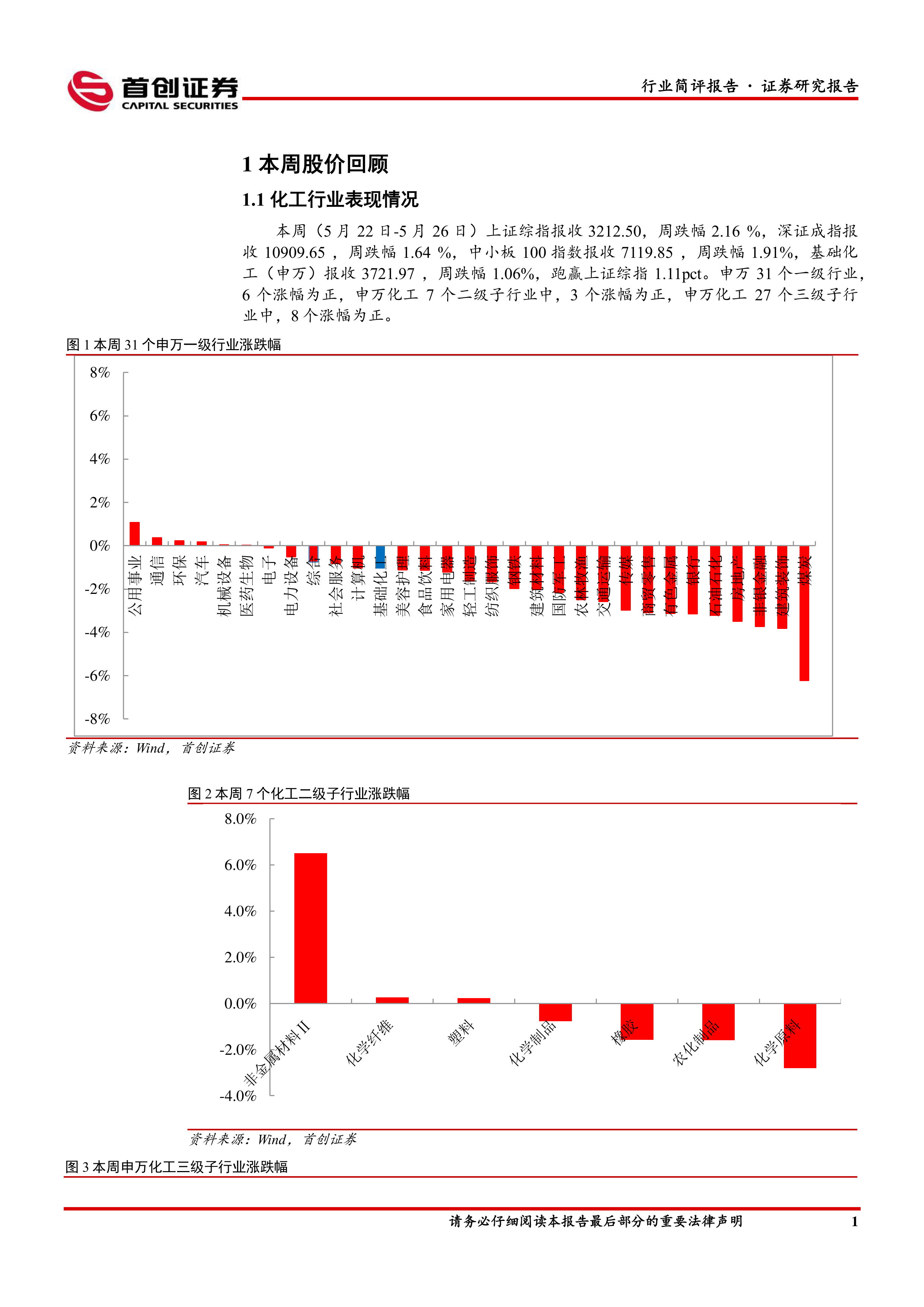 本周(5月22日-5月26日)上证综指下跌2.16%,深证成指下跌1.64%,中小板100指数下跌1.91%,基础化工(申万)下跌1.06%,跑赢上证综指1.11个百分点。申万31个一级行业中,6个上涨,申万化工7个二级子行业中,3个上涨,申万化工27个三级子行业中,8个上涨。