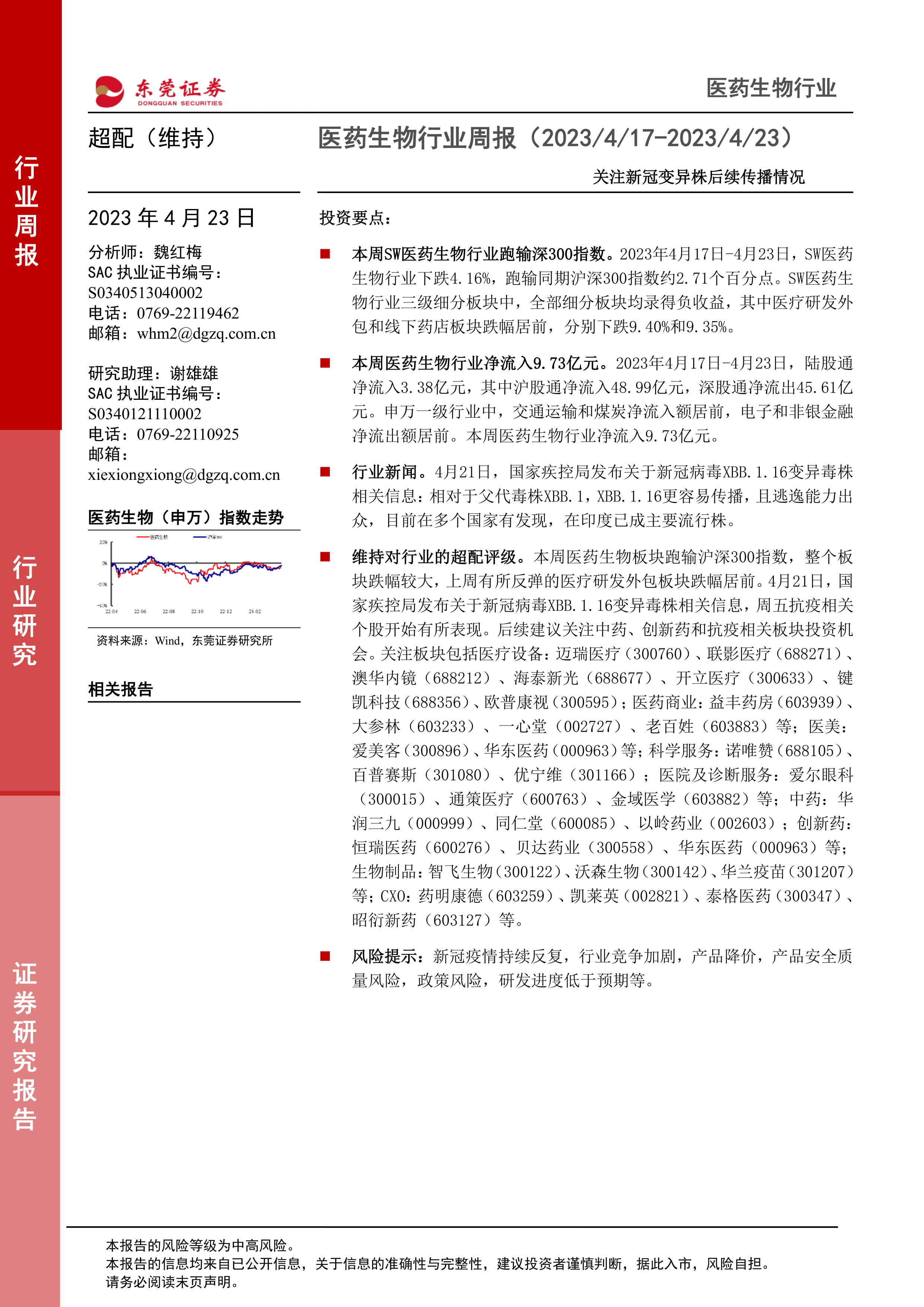 本报告分析了2023年4月17日至23日医药生物行业的市场表现,指出行业跑输大盘,细分板块全线下跌,但行业整体资金呈现净流入。报告重点关注了新冠病毒新变种XBB.1.16的传播情况以及国家卫健委发布的政策。维持对行业的超配评级,并建议关注中药、创新药和抗疫相关板块的投资机会。同时,报告也提示了行业面临的多种风险。