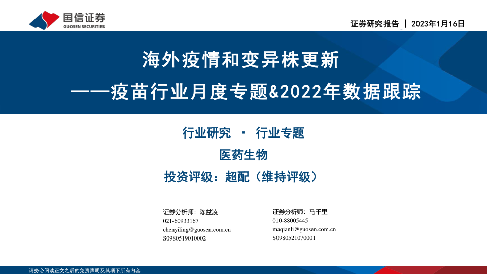 风险提示:全球疫情发生重大变化的风险;新冠疫苗研发失败或有效性低于预期的风险;批签发量波动以及批签发进度不及预期的风险;市场竞争加剧的风险等。