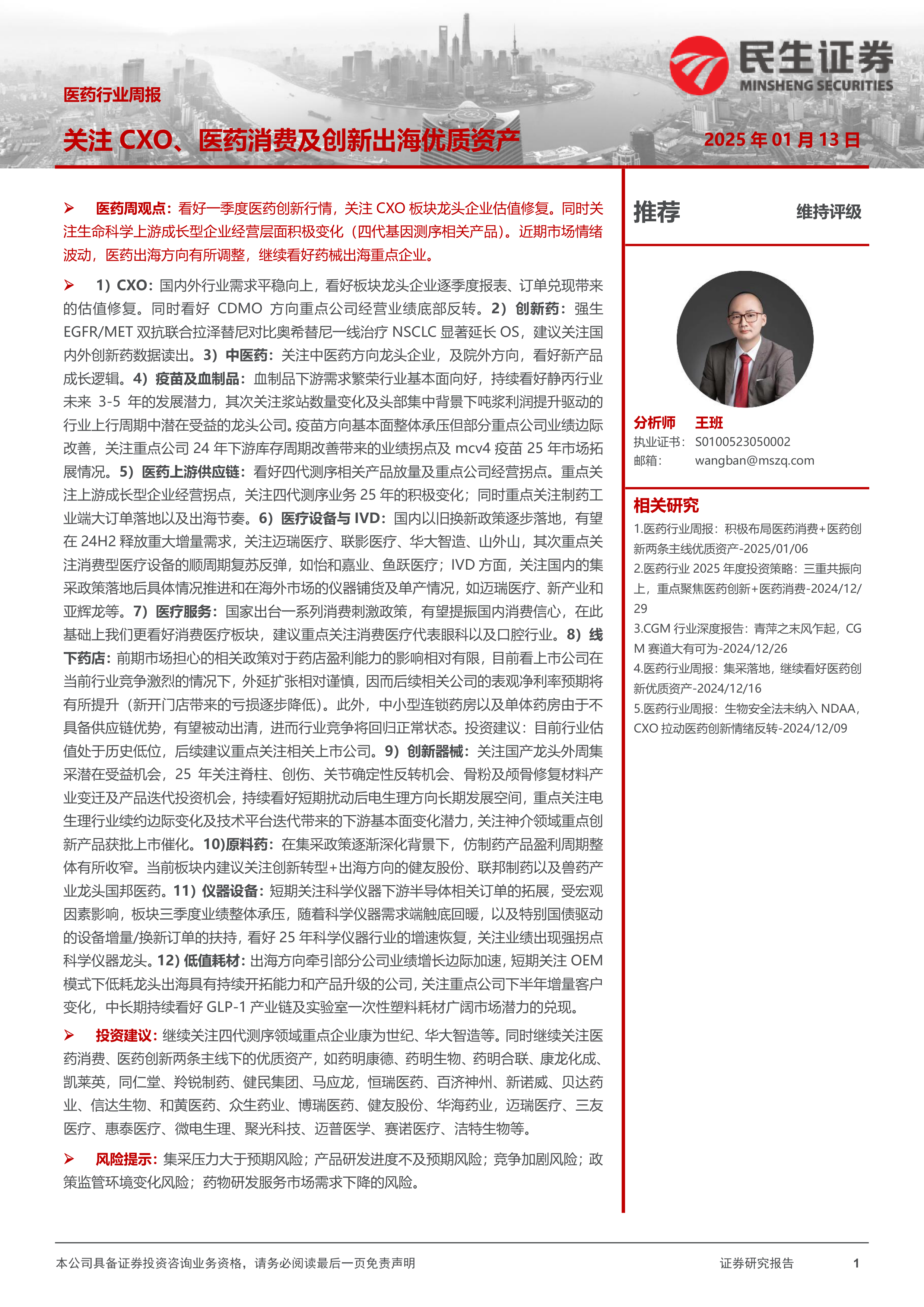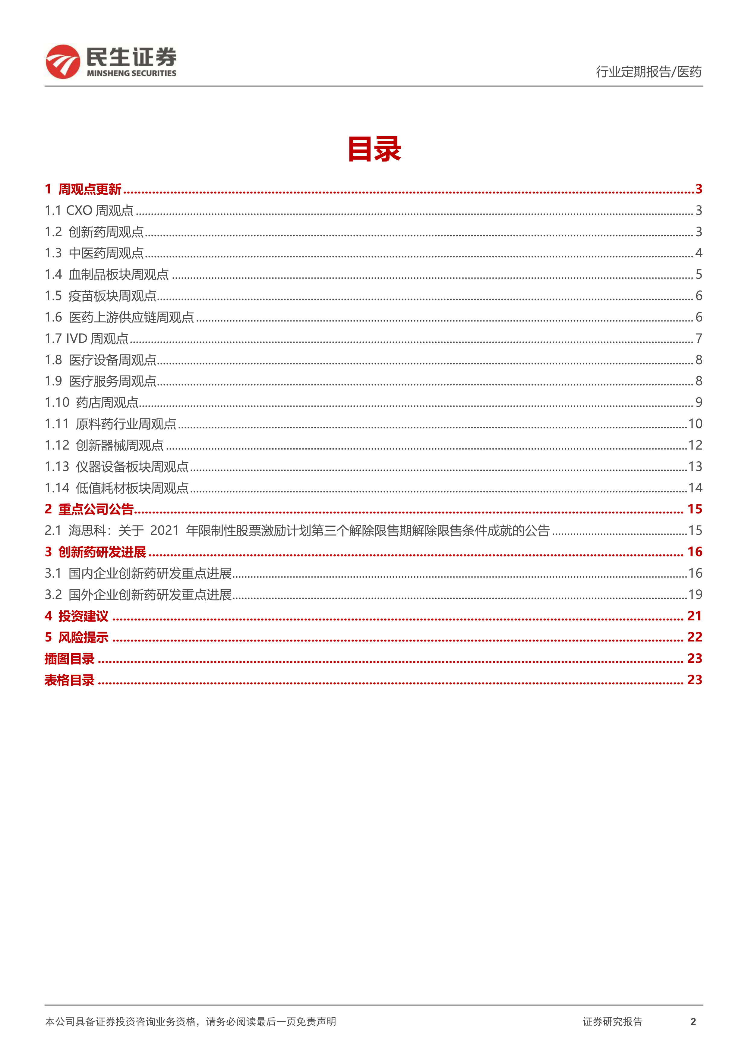 风险提示:集采压力大于预期风险;产品研发进度不及预期风险;竞争加剧风险;政策监管环境变化风险;药物研发服务市场需求下降的风险。