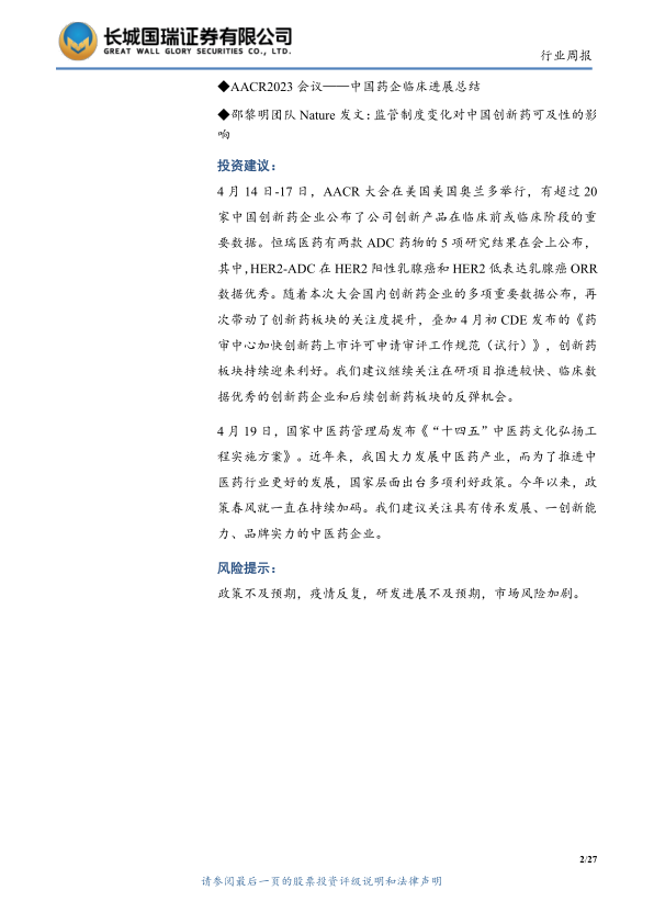 报告建议关注AACR大会上公布重要数据的创新药企业,以及在研项目推进较快、临床数据优秀的创新药板块的反弹机会。同时,报告也建议关注具有传承发展、一创新能力、品牌实力的中医药企业,以把握政策利好。