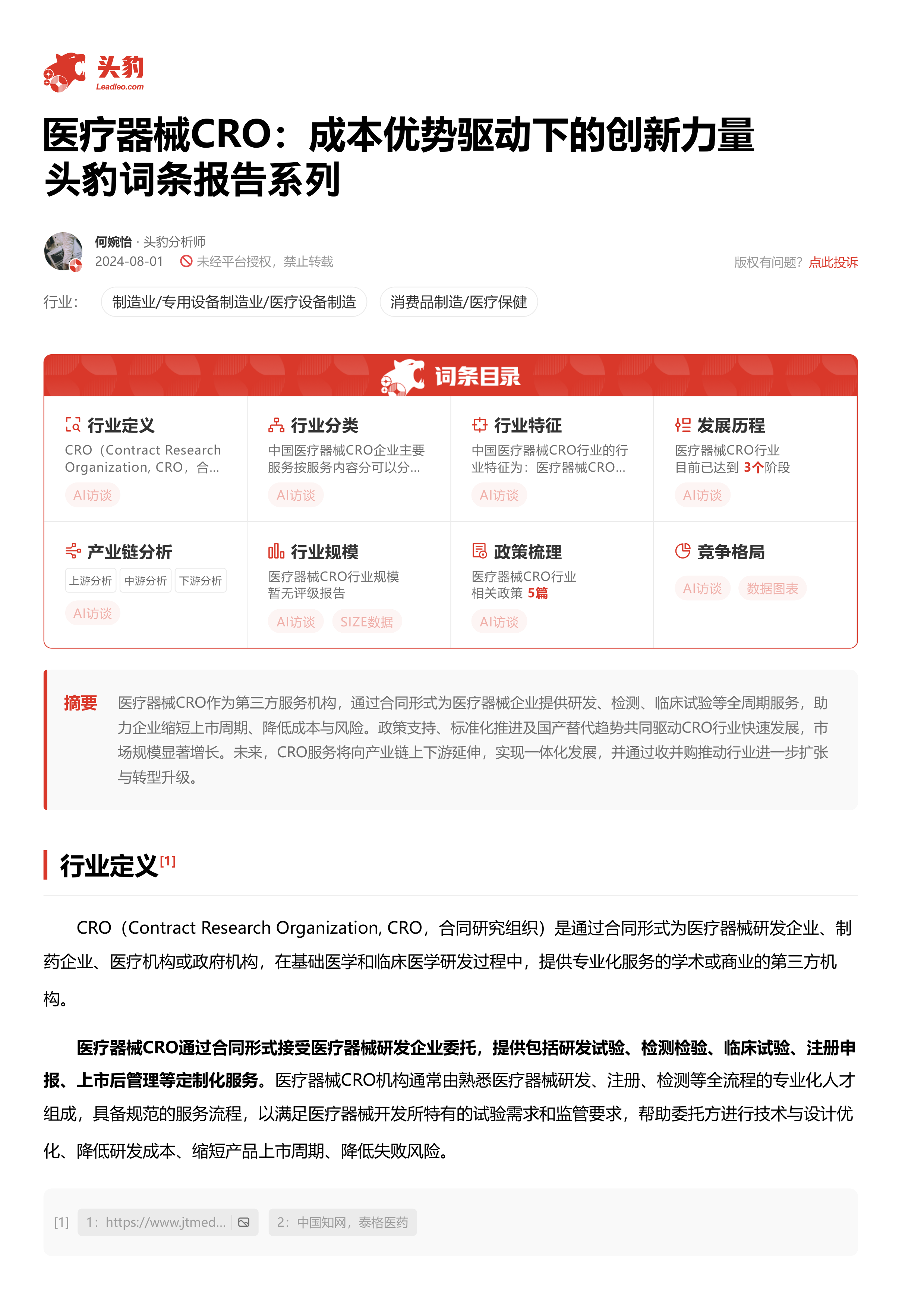医疗器械CRO:成本优势驱动下的创新力量 头豹词条报告系列