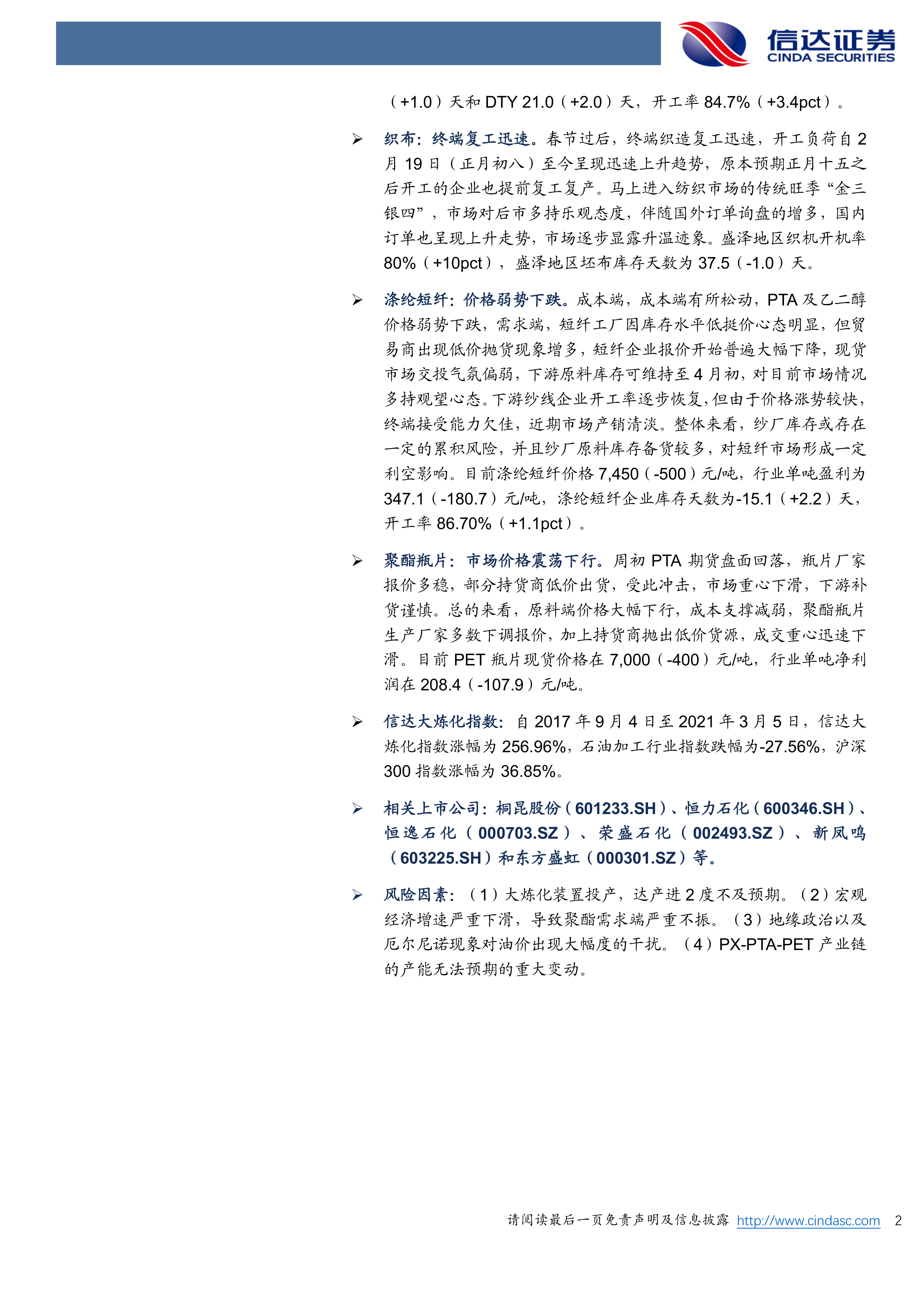 本报告的核心观点是:本周炼化行业呈现分化态势,长丝利润持续修复,但各产品市场表现不一。 具体而言,PX市场价格下跌但利润尚可,PTA市场出现回调,MEG市场重心回落,涤纶长丝市场先涨后稳,织布行业复工迅速,涤纶短纤价格弱势下跌,聚酯瓶片市场价格震荡下行。信达大炼化指数表现优于行业指数和沪深300指数。