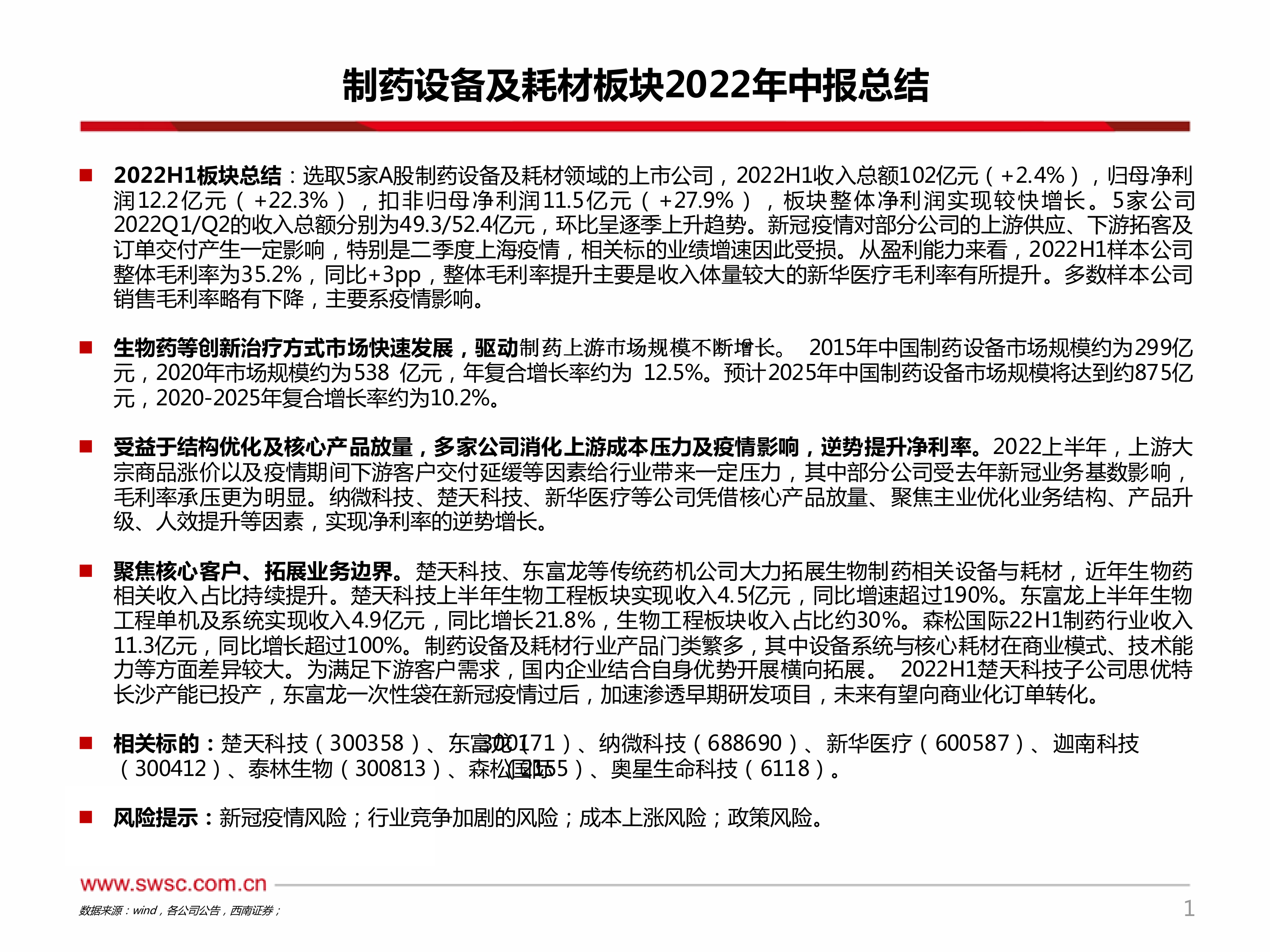 本报告总结了制药设备及耗材板块2022年上半年的经营情况,分析了疫情影响、市场规模增长、竞争格局等关键因素,并对行业未来发展趋势进行了展望。核心观点包括: