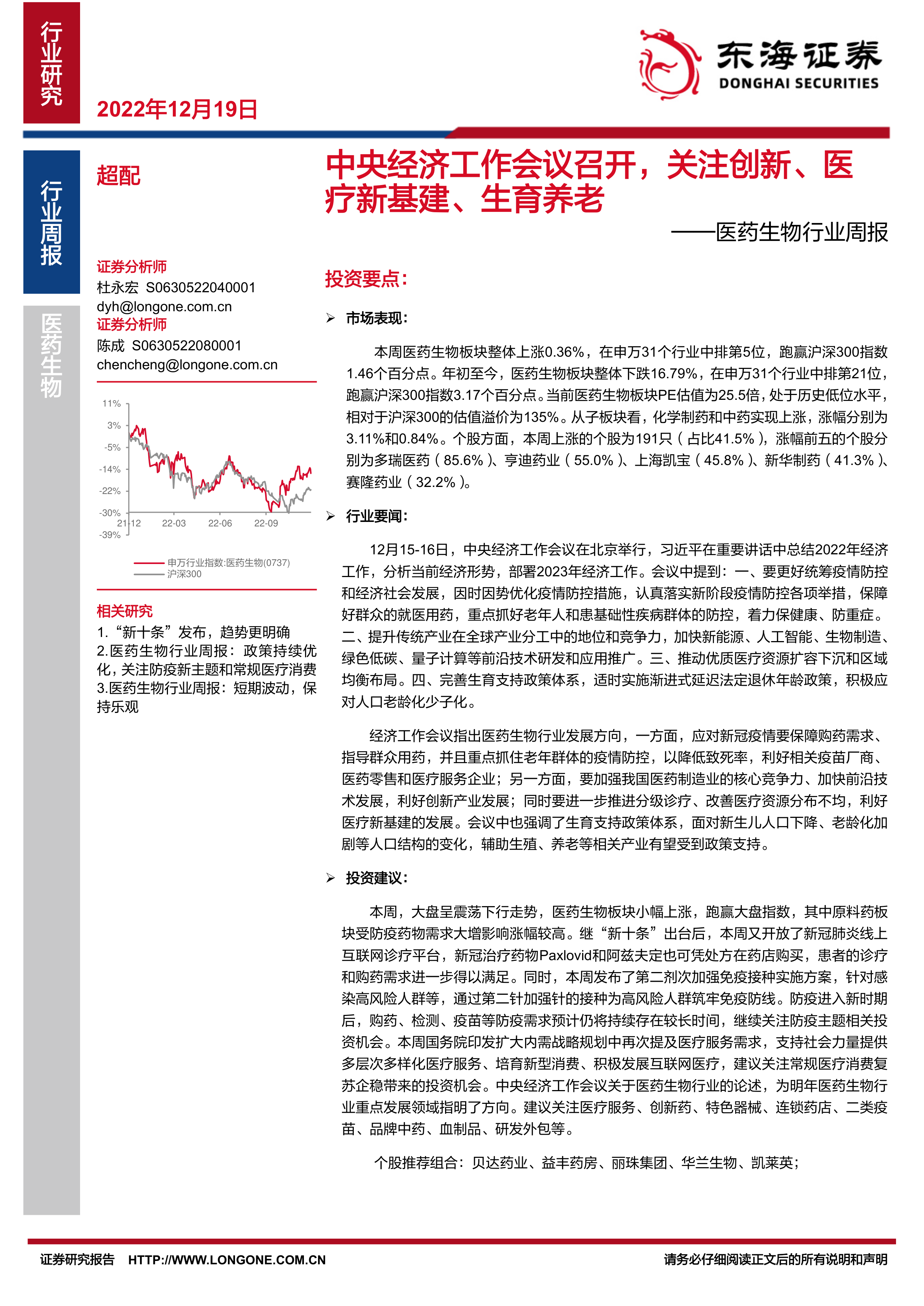 医药生物行业周报:中央经济工作会议召开,关注创新、医疗新基建、生育养老