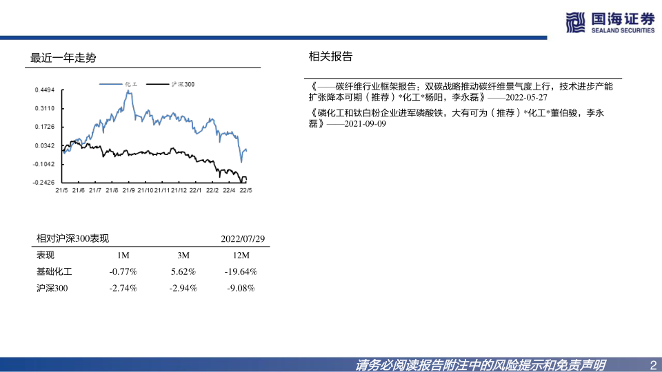 建议关注钒电池企业:国网英大、上海电气;上游钒资源企业:攀钢钒钛、龙佰集团、中核钛白、安宁股份、河钢股份、川发龙蟒;质子交换膜企业:东岳集团;碳纤维企业:光威复材、中复神鹰、吉林化纤、上海石化。综合考虑钒电池快速发展给上游钒电解液、质子交换膜、碳毡等材料带来需求的提升,进而带动五氧化二钒、氟化工、碳纤维等基础化工子行业的发展,维持基础化工行业“推荐”评级。