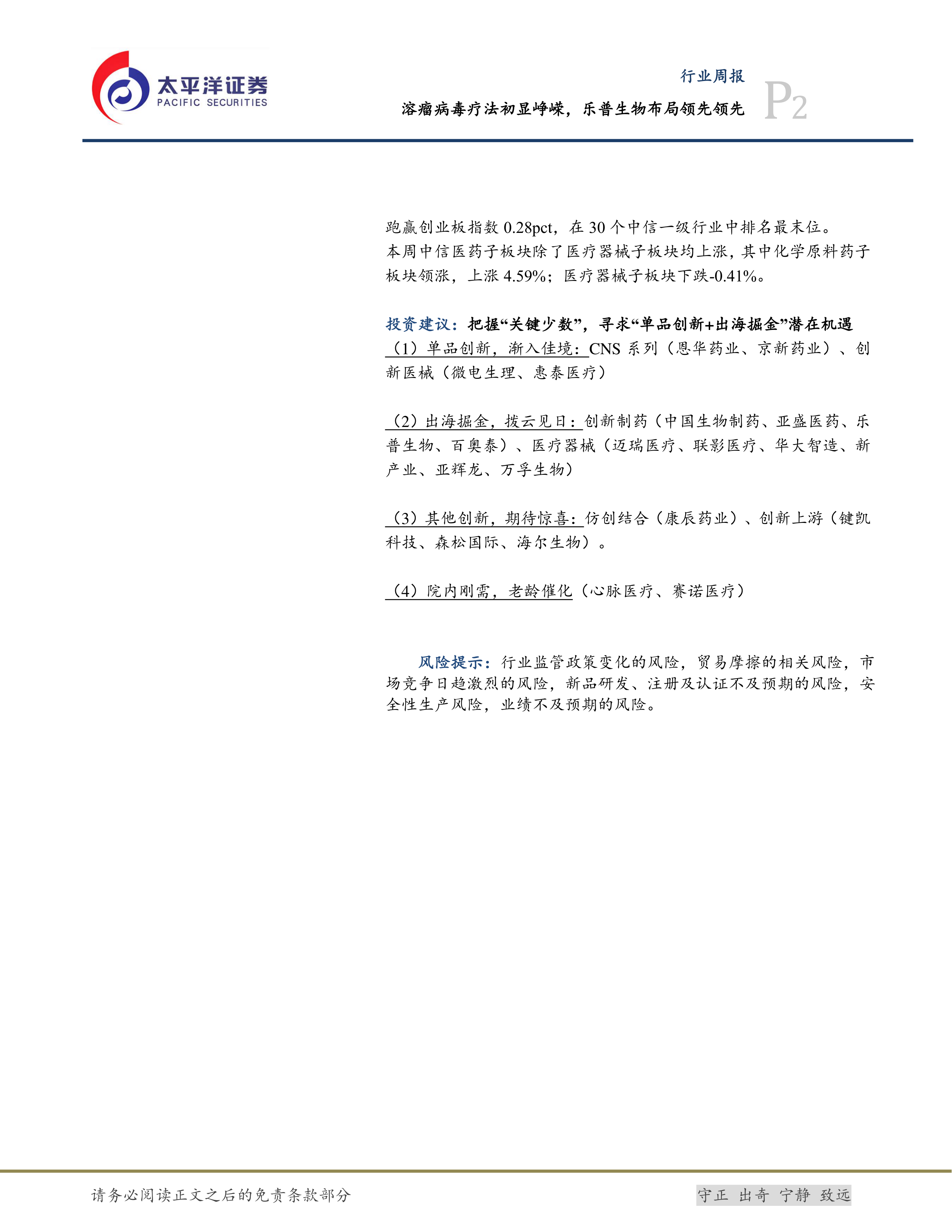 本报告深入分析了溶瘤病毒疗法的发展前景,强调了其市场潜力和联合治疗的优势。报告建议投资者关注“单品创新+出海掘金+院内刚需”的投资机遇,并对相关风险进行了提示。同时,报告回顾了本周医药板块的行情表现,包括板块估值、子板块表现以及资金流向等。