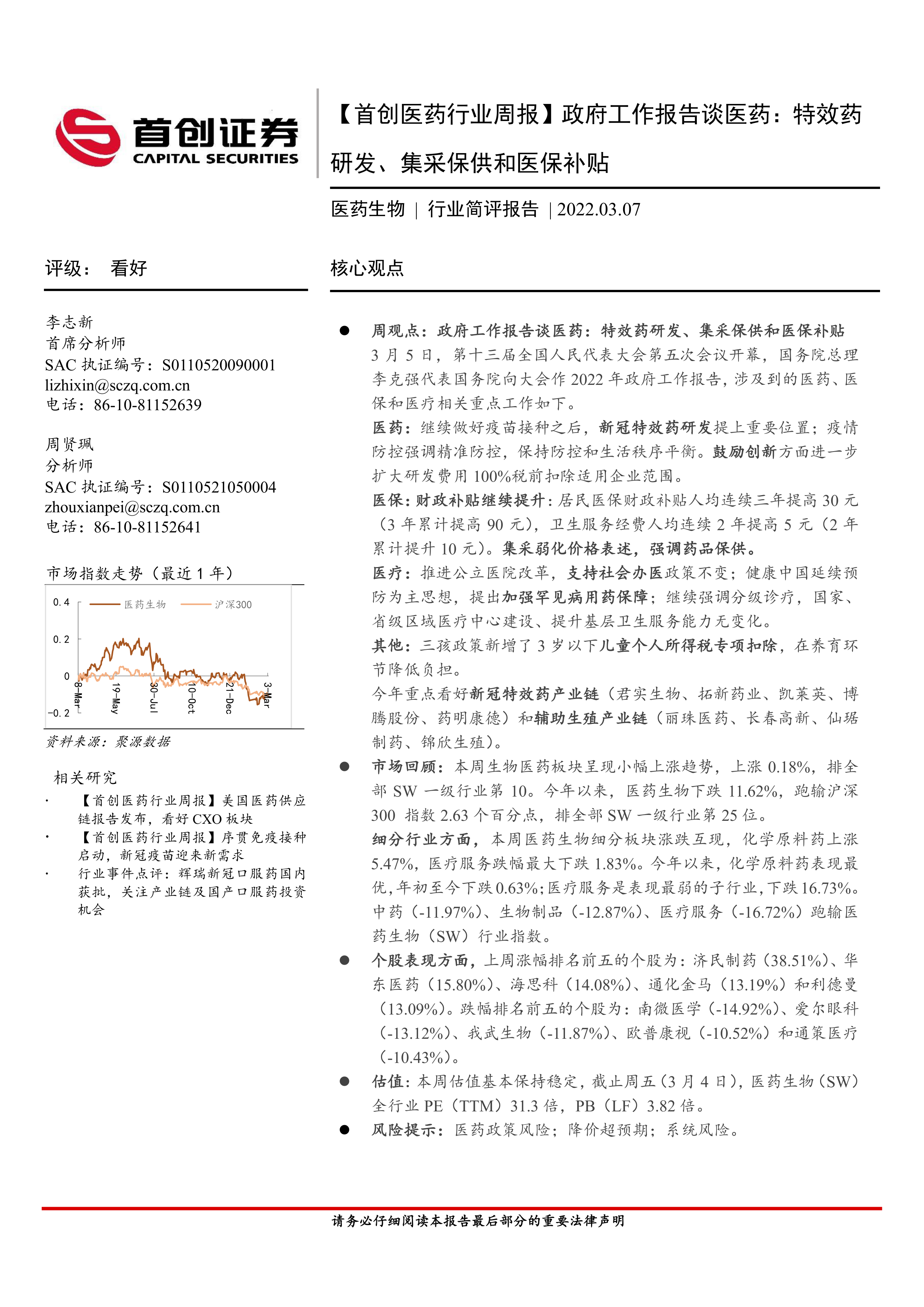 【首创医药行业周报】政府工作报告谈医药:特效药研发、集采保供和医保补贴
