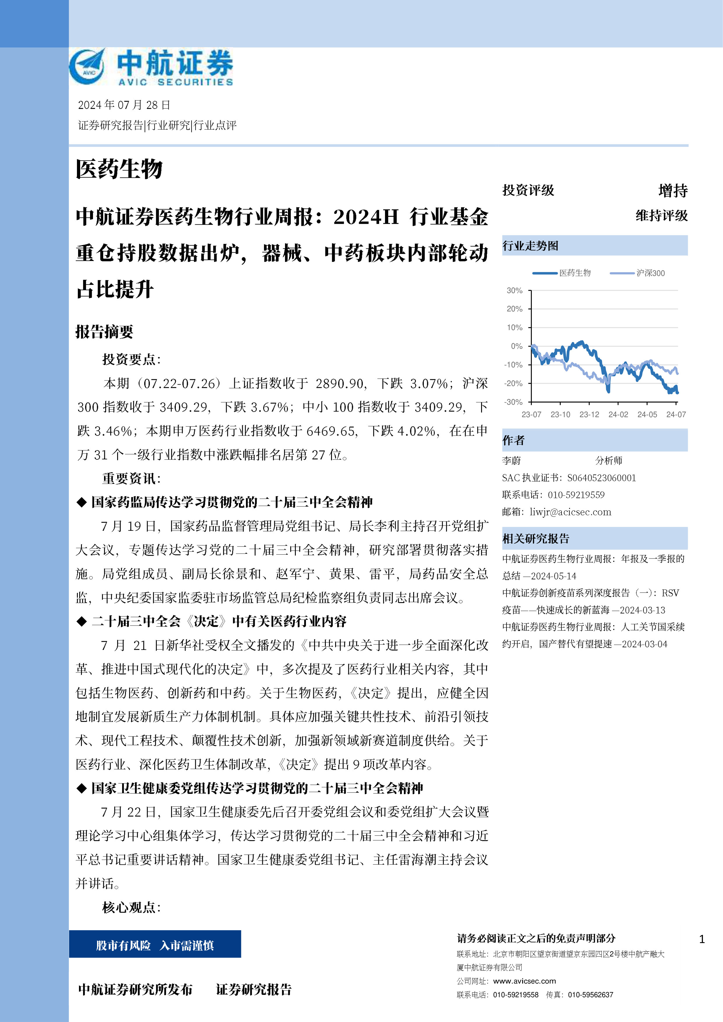 医药生物行业周报:2024H行业基金重仓持股数据出炉,器械、中药板块内部轮动占比提升