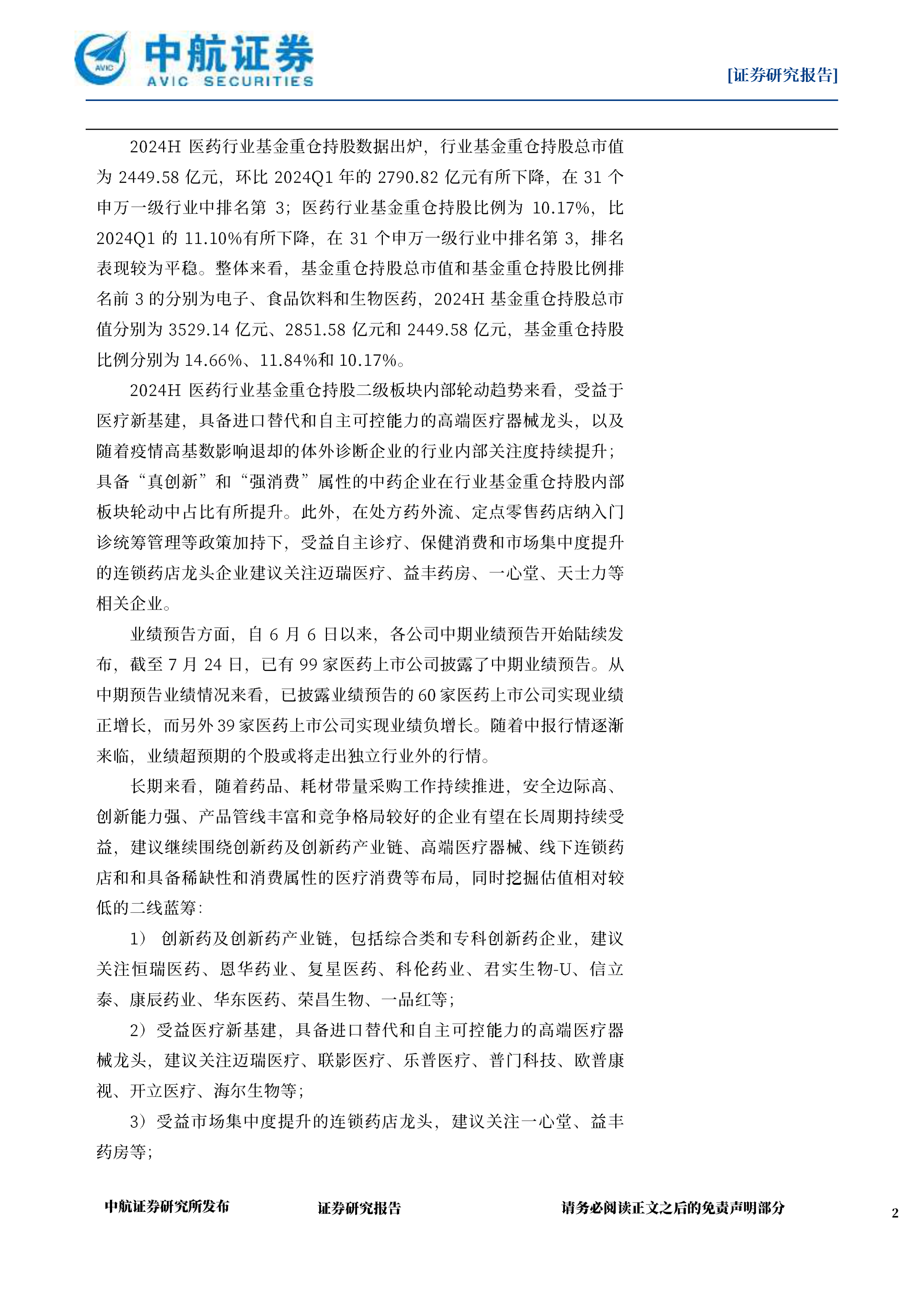 2024H医药行业基金重仓持股二级板块内部轮动趋势来看,受益于医疗新基建,具备进口替代和自主可控能力的高端医疗器械龙头,以及随着疫情高基数影响退却的体外诊断企业的行业内部关注度持续提升;具备“真创新”和“强消费”属性的中药企业在行业基金重仓持股内部板块轮动中占比有所提升。此外,在处方药外流、定点零售药店纳入门诊统筹管理等政策加持下,受益自主诊疗、保健消费和市场集中度提升的连锁药店龙头企业建议关注迈瑞医疗、益丰药房、一心堂、天士力等相关企业。