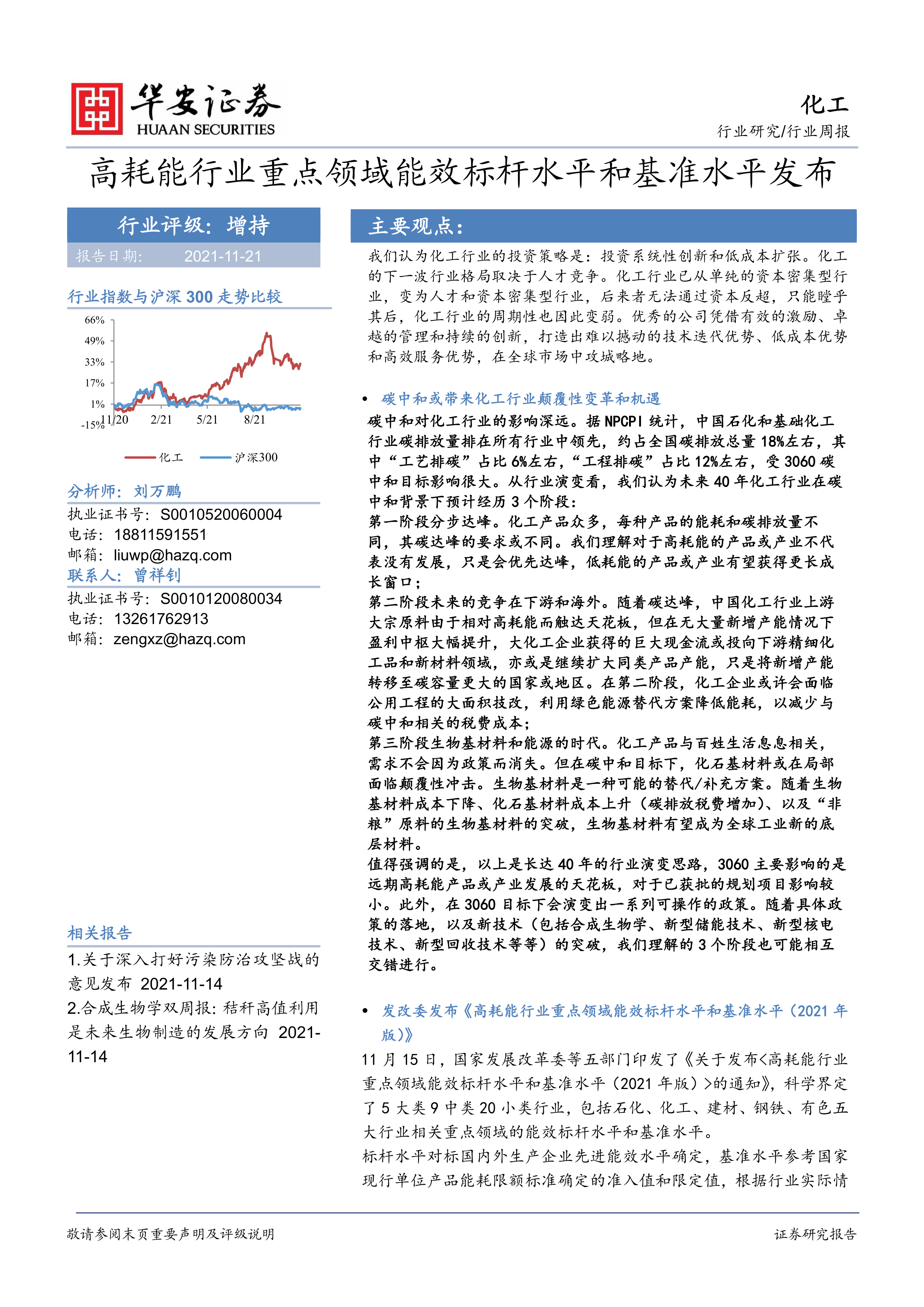 化工行业周报:高耗能行业重点领域能效标杆水平和基准水平发布