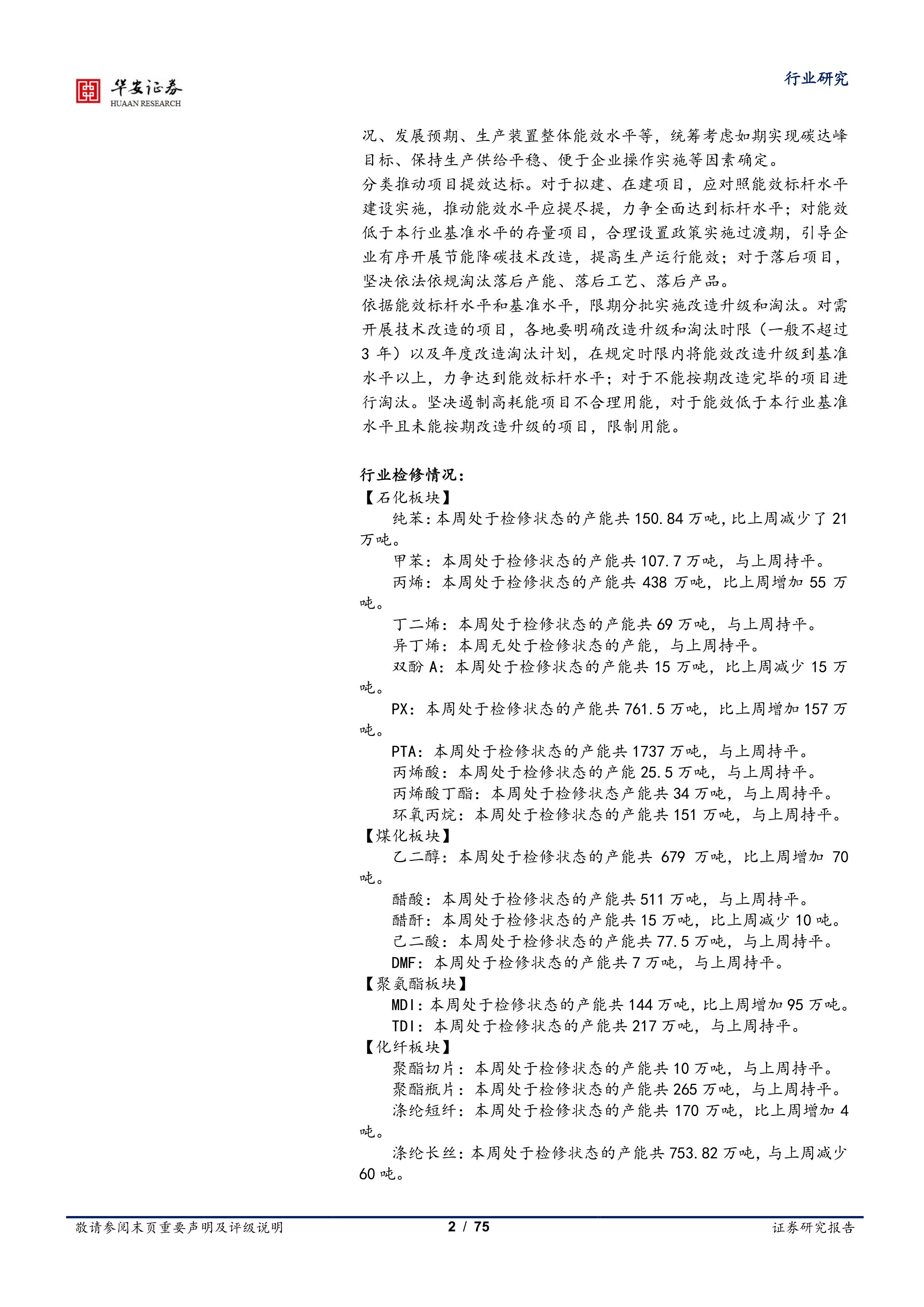 依据能效标杆水平和基准水平,限期分批实施改造升级和淘汰。对需开展技术改造的项目,各地要明确改造升级和淘汰时限(一般不超过3 年)以及年度改造淘汰计划,在规定时限内将能效改造升级到基准水平以上,力争达到能效标杆水平;对于不能按期改造完毕的项目进行淘汰。坚决遏制高耗能项目不合理用能,对于能效低于本行业基准水平且未能按期改造升级的项目,限制用能。行业检修情况: