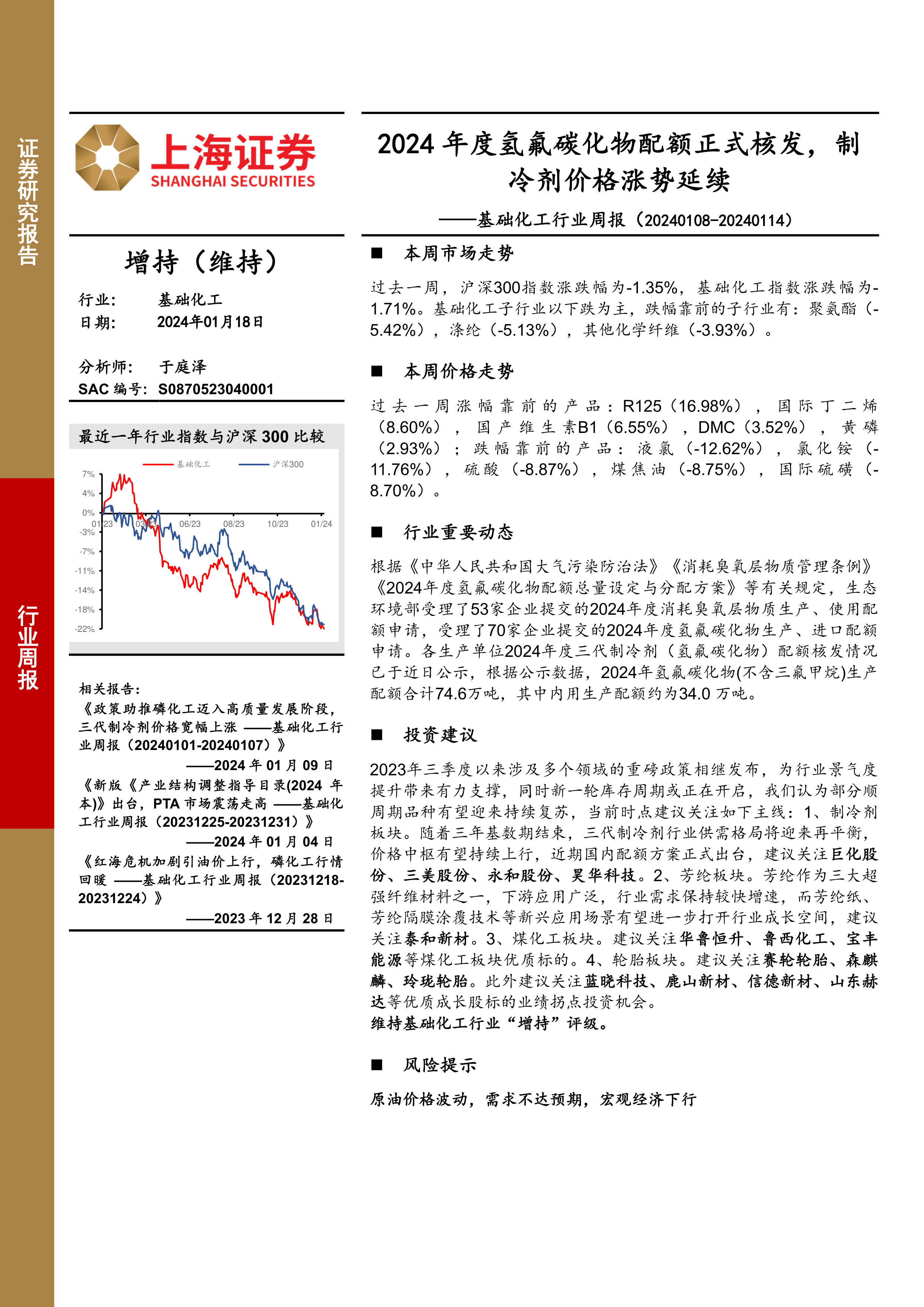 本报告分析了 2024 年 1 月 8 日至 1 月 14 日期间基础化工行业的市场表现、价格走势和行业动态。 报告重点关注了氢氟碳化物配额核发对制冷剂板块的影响,并对原油、化纤、煤化工、磷化工、PVC、纯碱、钛白粉、维生素、聚氨酯、农化、氟化工和锂电化学品等细分行业进行了分析。 报告认为,在政策支持和库存周期开启的背景下,部分顺周期品种有望迎来复苏,并维持基础化工行业“增持”评级。