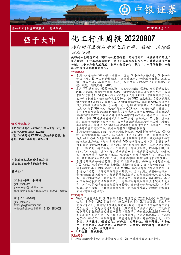 本报告分析了 2022 年 8 月初基础化工行业的市场表现,指出原油价格回落、部分化工品价格下跌的趋势,并强调了美联储加息预期、全球经济衰退风险等宏观因素对行业的影响。报告建议关注一体化龙头公司及高景气度子行业,并重点推荐雅克科技。同时,报告详细分析了硫磺、丙烯酸等重点化工品的价格波动原因,为投资者提供了重要的参考信息。