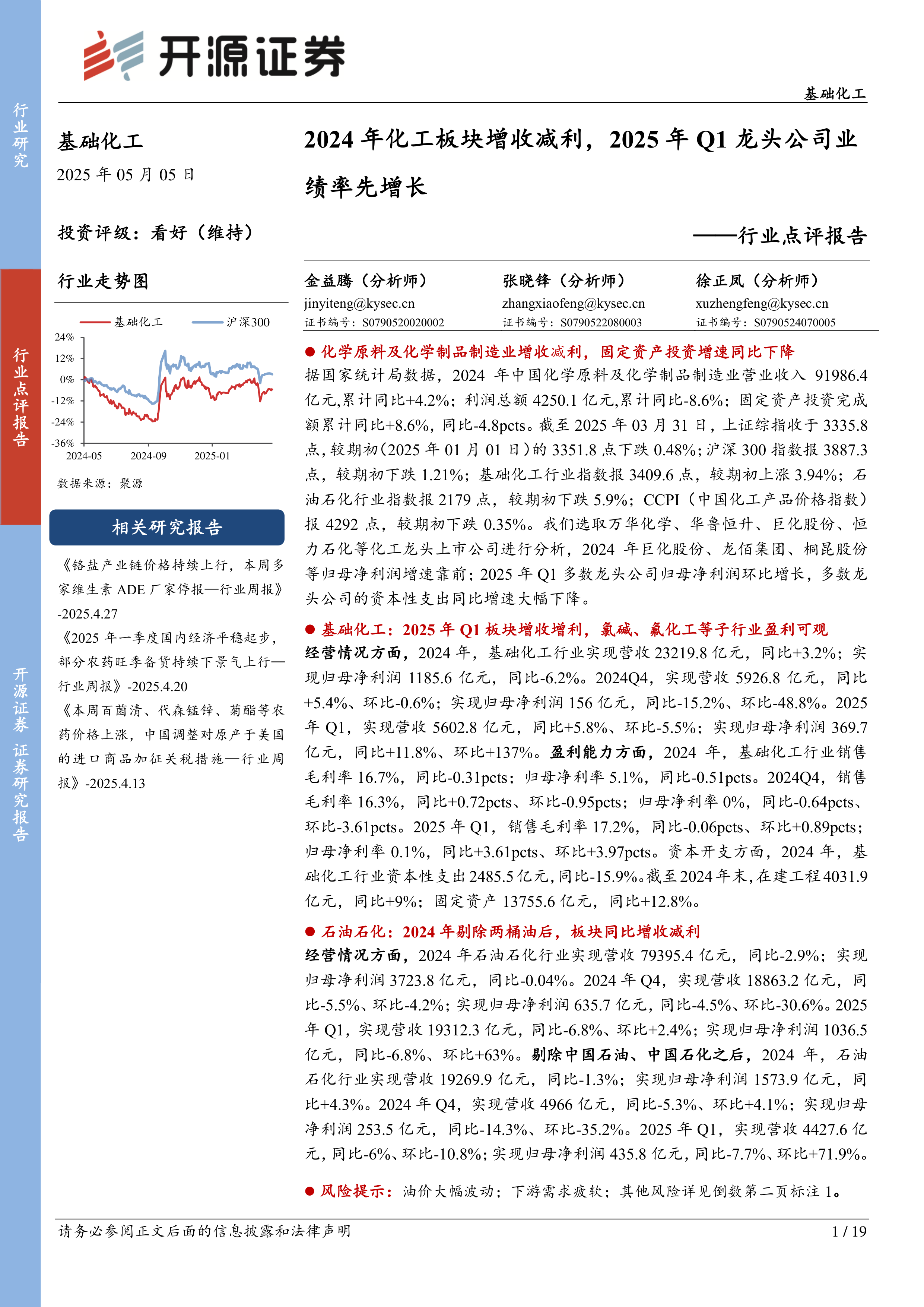 基础化工行业点评报告:2024年化工板块增收减利,2025年Q1龙头公司业绩率先增长