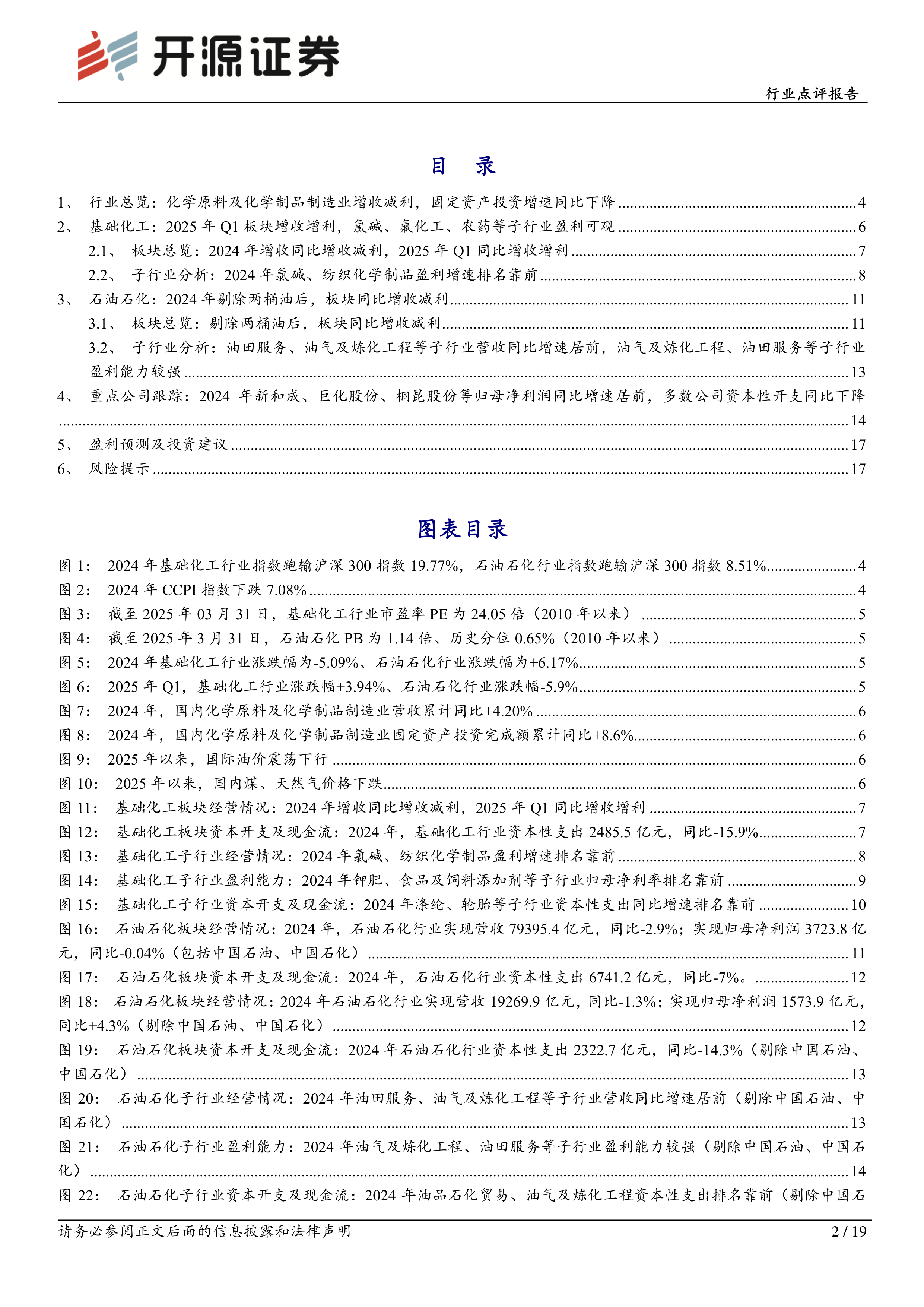 本报告分析了2024年及2025年Q1基础化工行业的市场表现,指出行业在2024年面临增收减利、固定资产投资增速下降的挑战,但2025年Q1呈现复苏迹象,龙头公司业绩率先增长。报告深入分析了基础化工和石油石化两大板块的经营情况、盈利能力、资本开支及现金流,并对子行业进行了细致的对比分析。同时,报告跟踪了重点公司的业绩表现,并给出了投资建议。 报告提示了油价波动、下游需求疲软等风险因素。