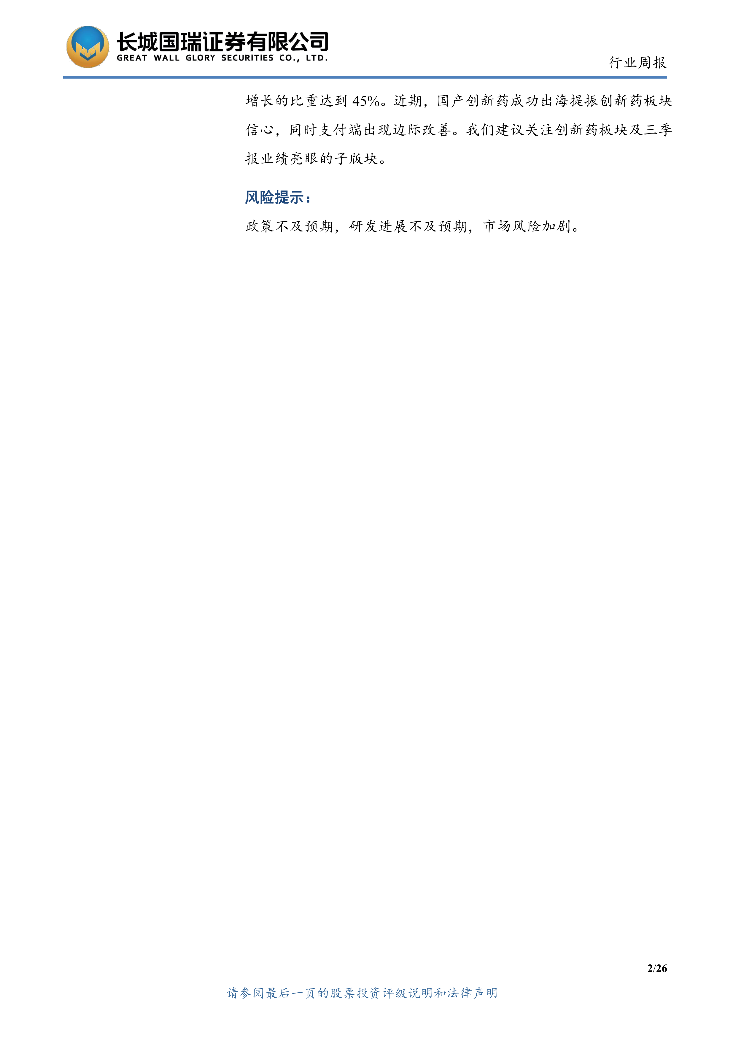 本报告对 2023 年三季度医药生物行业的表现进行了全面分析,指出行业整体呈现分化态势,部分子板块表现突出,并对行业重要资讯和公司动态进行了梳理。报告强调了创新药板块及业绩亮眼子板块的投资价值,并提供了具体的投资建议。