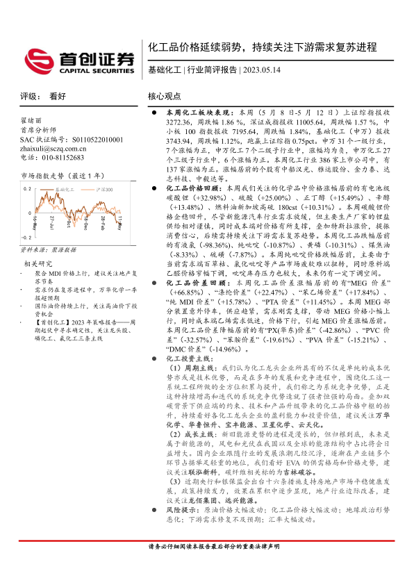 基础化工行业简评报告:化工品价格延续弱势,持续关注下游需求复苏进程