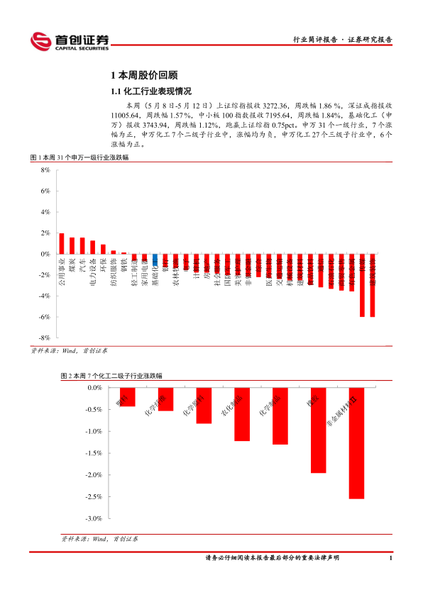 本周化工板块表现:本周(5月8日-5月12日)上证综指报收3272.36,周跌幅1.86%,深证成指报收11005.64,周跌幅1.57%,中小板100指数报收7195.64,周跌幅1.84%,基础化工(申万)报收3743.94,周跌幅1.12%,跑赢上证综指0.75pct。申万31个一级行业,7个涨幅为正,申万化工7个二级子行业中,涨幅均为负,申万化工27个三级子行业中,6个涨幅为正。本周化工行业386家上市公司中,有137家涨幅为正。涨幅居前的个股有中船汉光、雅运股份、金力泰、达志科技、中毅达等。