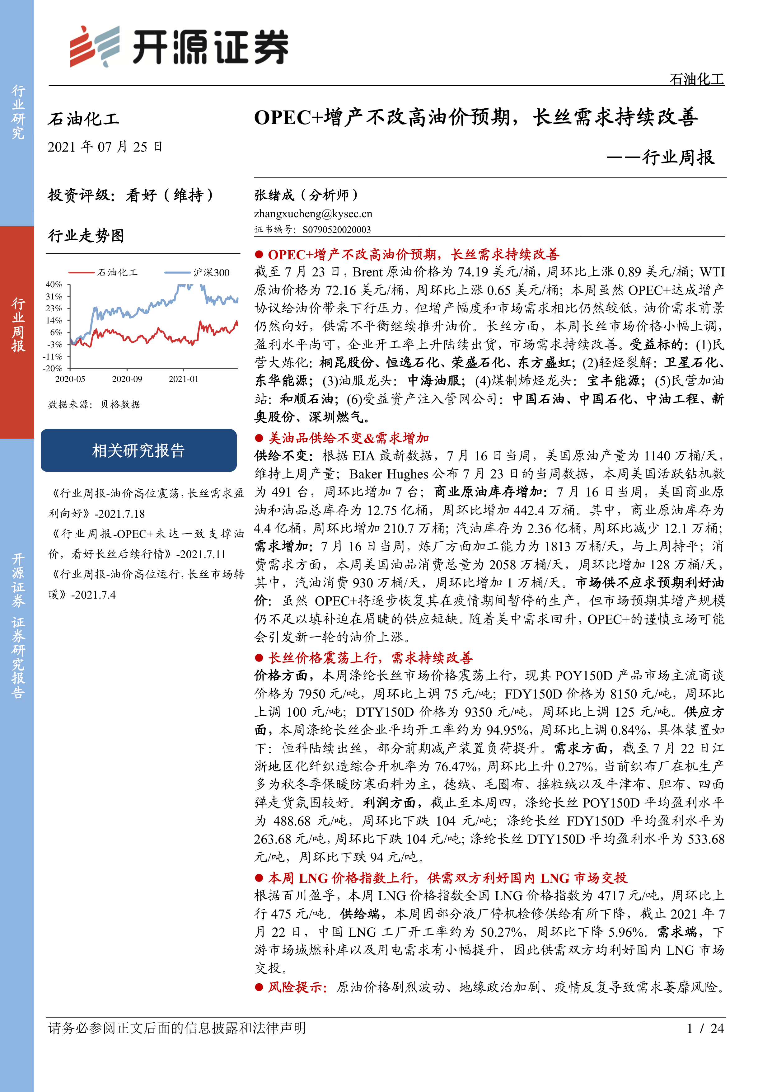 石油化工行业周报:OPEC+增产不改高油价预期,长丝需求持续改善