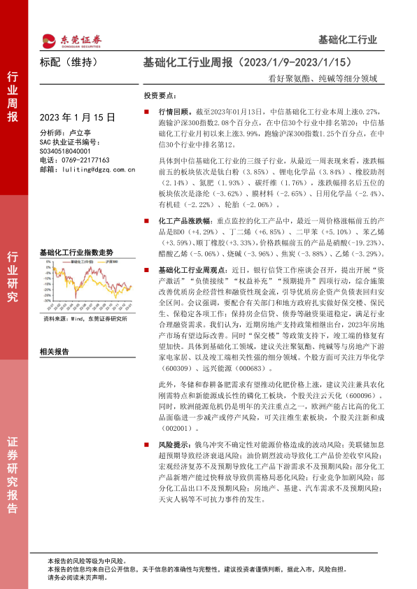 行情回顾。截至2023年01月13日,中信基础化工行业本周上涨0.27%,跑输沪深300指数2.08个百分点,在中信30个行业中排名第20;中信基础化工行业月初以来上涨3.99%,跑输沪深300指数1.25个百分点,在中信30个行业中排名第12。