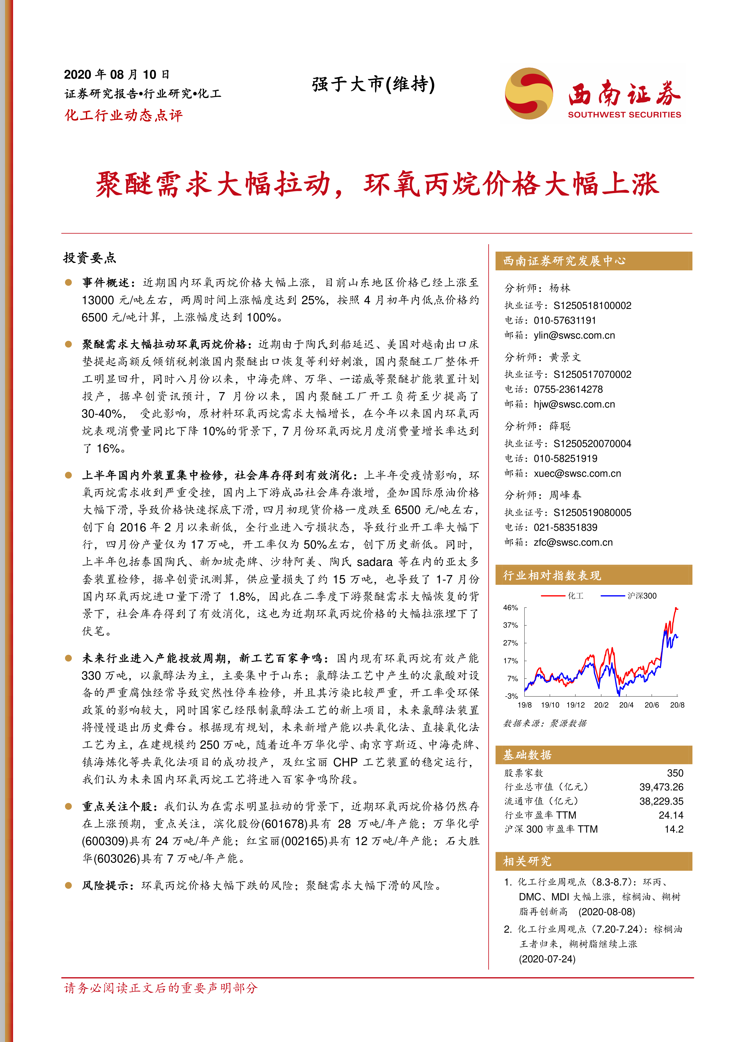 化工行业动态点评:聚醚需求大幅拉动,环氧丙烷价格大幅上涨