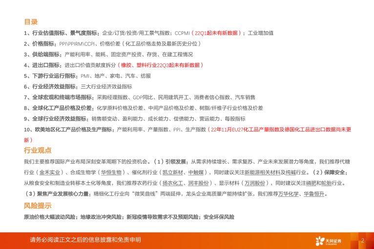 本报告通过对2022年11月基础化工行业的多项指标进行跟踪,全面分析了行业的运行状况,并结合宏观经济、下游需求和全球市场等因素,为投资者提供了行业景气度、价格走势、供给端变化、进出口情况、下游行业表现、经济效益以及全球市场表现等方面的分析。报告还提出了投资建议,并提示了相关风险,为投资者提供了全面的参考。