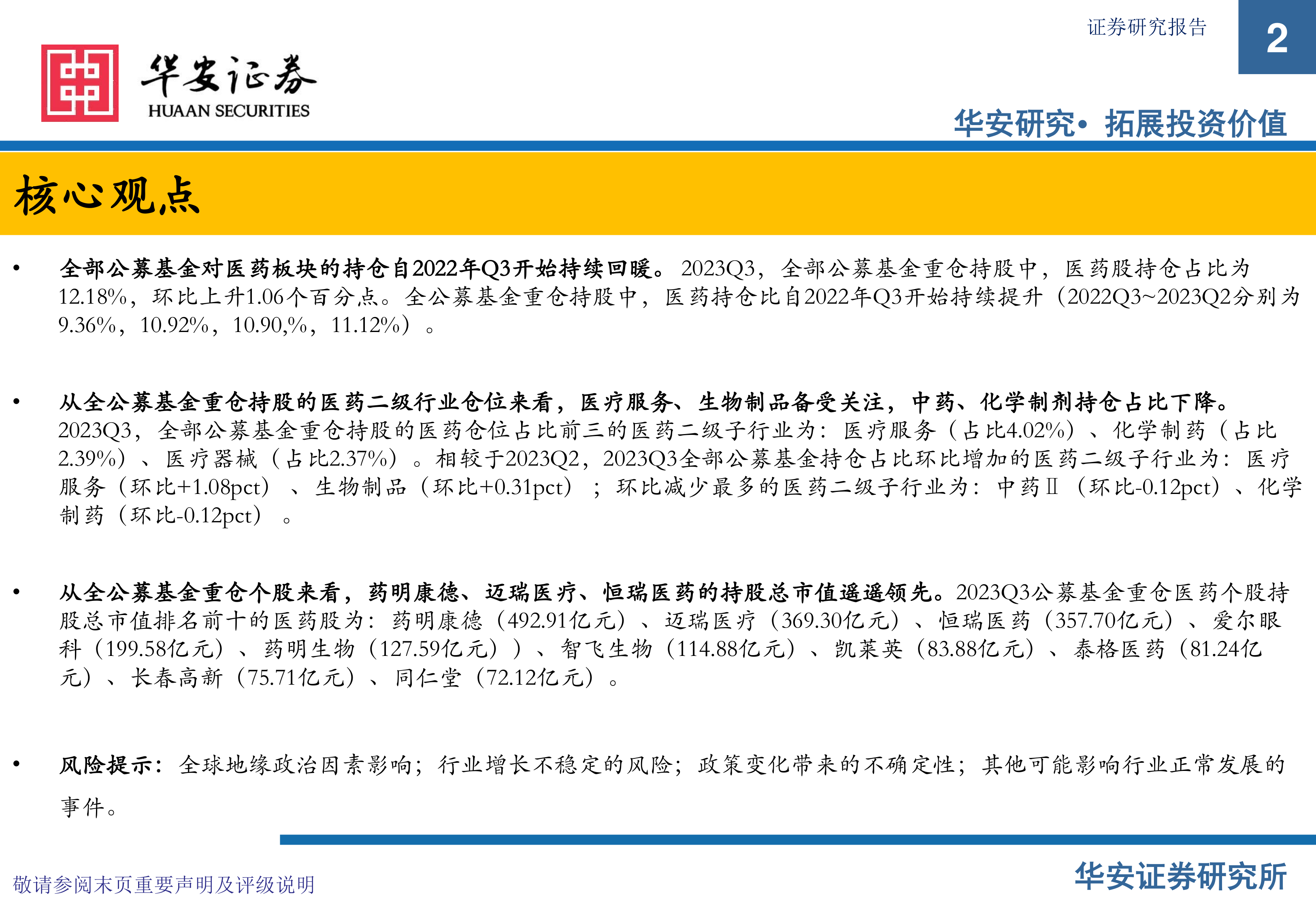 本报告分析了2023年第三季度公募基金在医药板块的持仓情况。 报告显示,公募基金对医药板块的持仓持续回暖,持仓占比有所上升。 医疗服务和生物制品等细分行业受到更多关注。 药明康德、迈瑞医疗、恒瑞医药等个股的持股总市值较高。 报告也提示了全球地缘政治、行业增长、政策变化等风险因素。