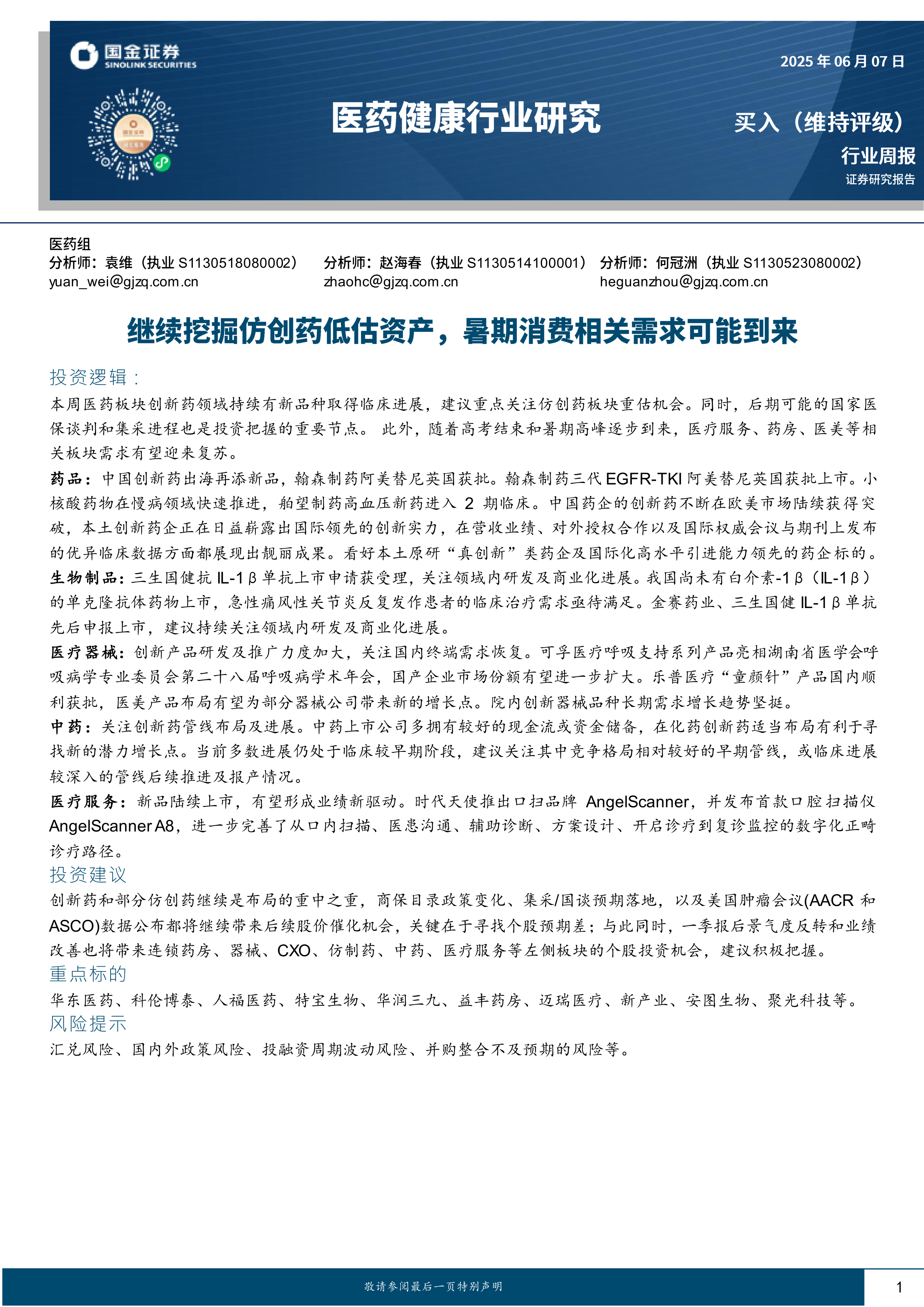 医药健康行业研究:继续挖掘仿创药低估资产,暑期消费相关需求可能到来