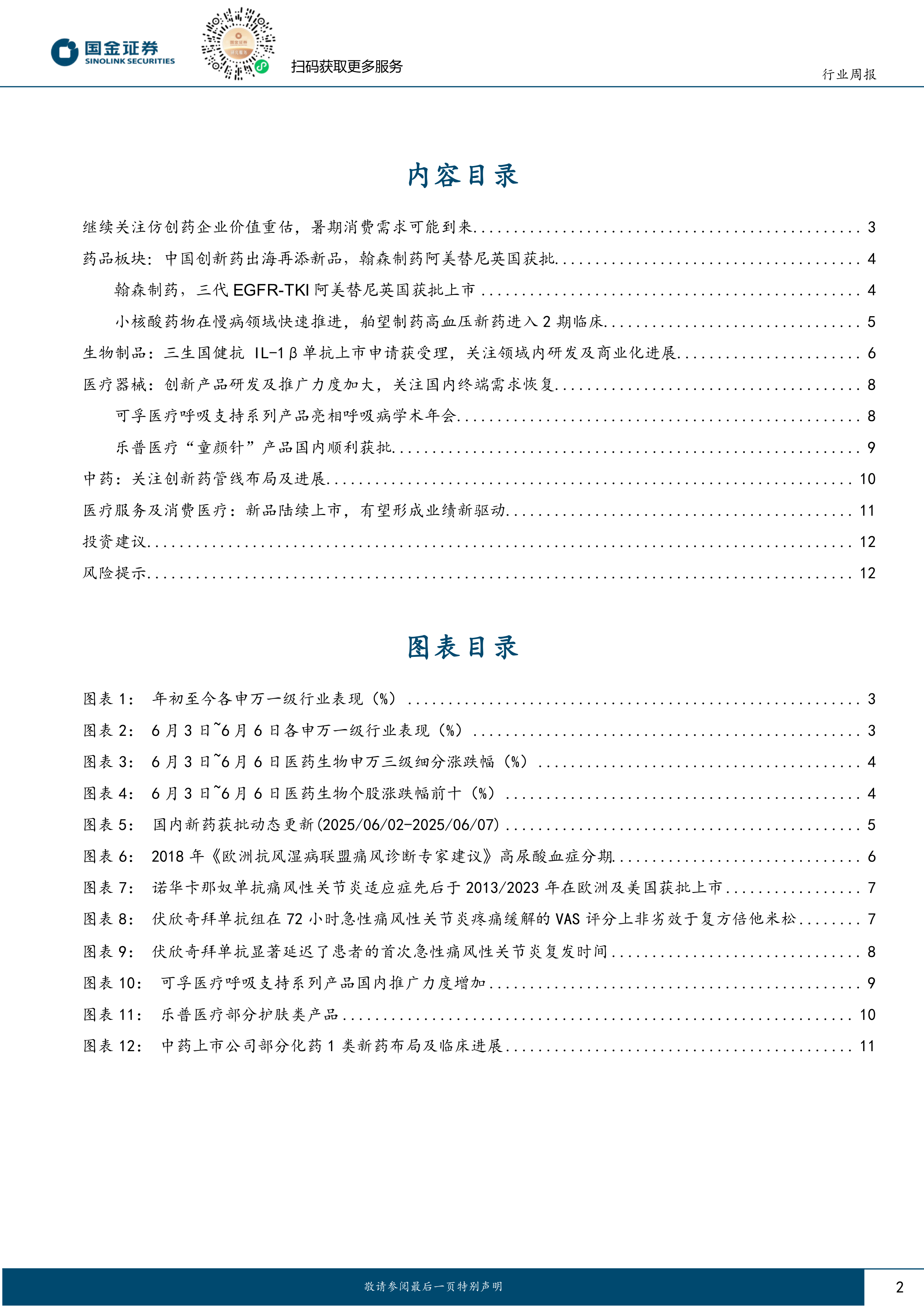 药品:中国创新药出海再添新品,翰森制药阿美替尼英国获批。翰森制药三代EGFR-TKI阿美替尼英国获批上市。小核酸药物在慢病领域快速推进,舶望制药高血压新药进入2期临床。中国药企的创新药不断在欧美市场陆续获得突破,本土创新药企正在日益崭露出国际领先的创新实力,在营收业绩、对外授权合作以及国际权威会议与期刊上发布的优异临床数据方面都展现出靓丽成果。看好本土原研“真创新”类药企及国际化高水平引进能力领先的药企标的。生物制品:三生国健抗IL-1β单抗上市申请获受理,关注领域内研发及商业化进展。我国尚未有白介素-1β(IL-1β)的单克隆抗体药物上市,急性痛风性关节炎反复发作患者的临床治疗需求亟待满足。金赛药业、三生国健IL-1β单抗先后申报上市,建议持续关注领域内研发及商业化进展。