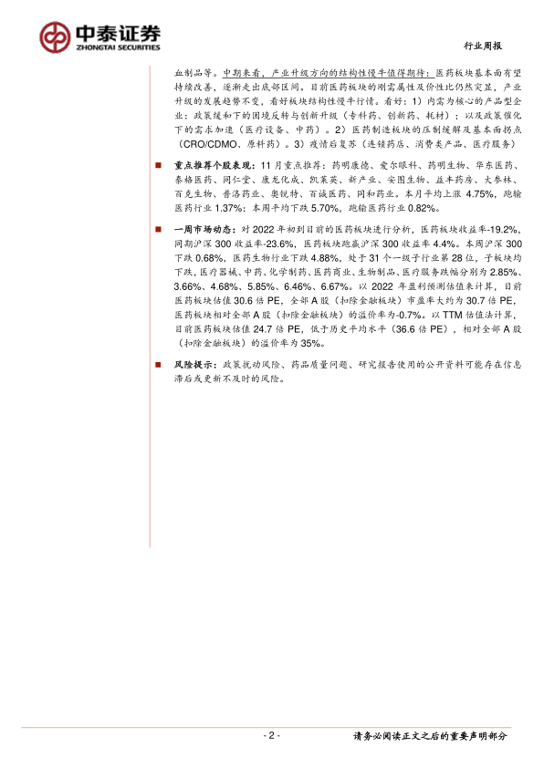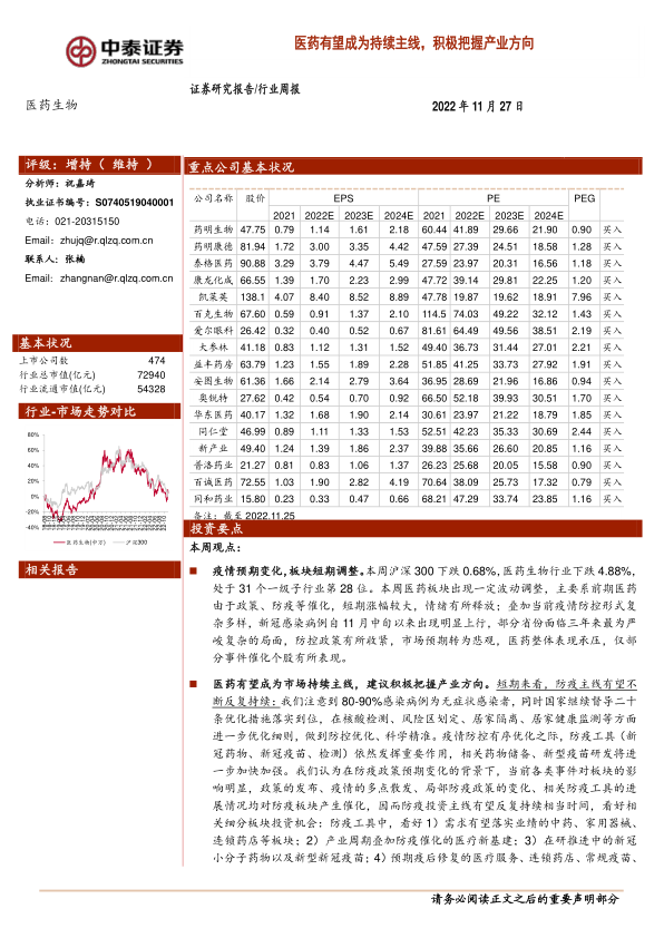 医药有望成为市场持续主线,建议积极把握产业方向。短期来看,防疫主线有望不断反复持续:我们注意到80-90%感染病例为无症状感染者,同时国家继续督导二十条优化措施落实到位,在核酸检测、风险区划定、居家隔离、居家健康监测等方面进一步优化细则,做到防控优化、科学精准。疫情防控有序优化之际,防疫工具(新冠药物、新冠疫苗、检测)依然发挥重要作用,相关药物储备、新型疫苗研发将进一步加快加强。我们认为在防疫政策预期变化的背景下,当前各类事件对板块的影响明显,政策的发布、疫情的多点散发、局部防疫政策的变化、相关防疫工具的进展情况均对防疫板块产生催化,因而防疫投资主线有望反复持续相当时间,看好相关细分板块投资机会:防疫工具中,看好1)需求有望落实业绩的中药、家用器械、连锁药店等板块;2)产业周期叠加防疫催化的医疗新基建;3)在研推进中的新冠小分子药物以及新型新冠疫苗;4)预期疫后修复的医疗服务、连锁药店、常规疫苗、血制品等。中期来看,产业升级方向的结构性慢牛值得期待:医药板块基本面有望持续改善,逐渐走出底部区间。目前医药板块的刚需属性及价性比仍然突显,产业升级的发展趋势不变,看好板块结构性慢牛行情。看好:1)内需为核心的产品型企业:政策缓和下的困境反转与创新升级(专科药、创新药、耗材);以及政策催化下的需求加速(医疗设备、中药)。2)医药制造板块的压制缓解及基本面拐点(CRO/CDMO、原料药)。3)疫情后复苏(连锁药店、消费类产品、医疗服务)