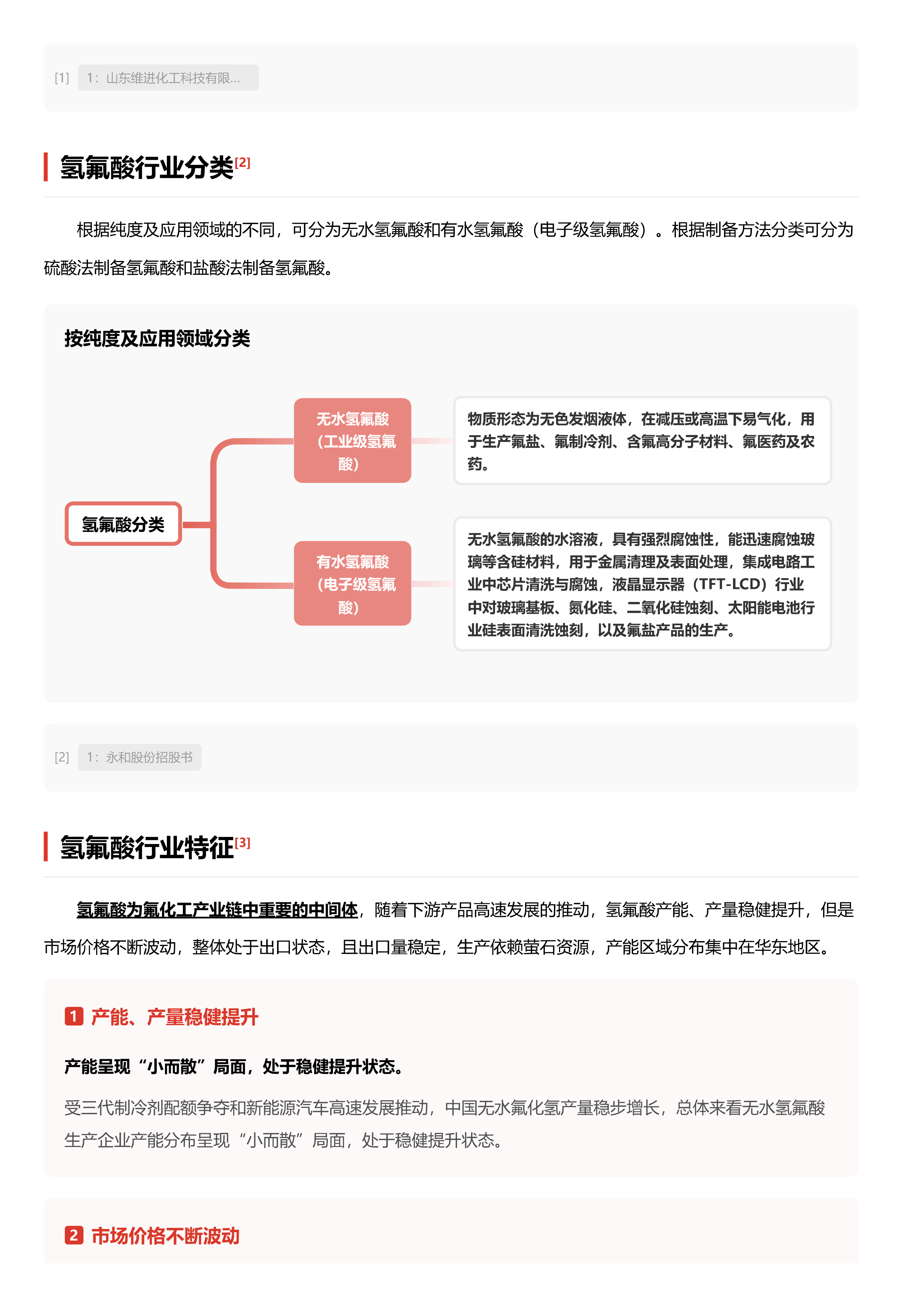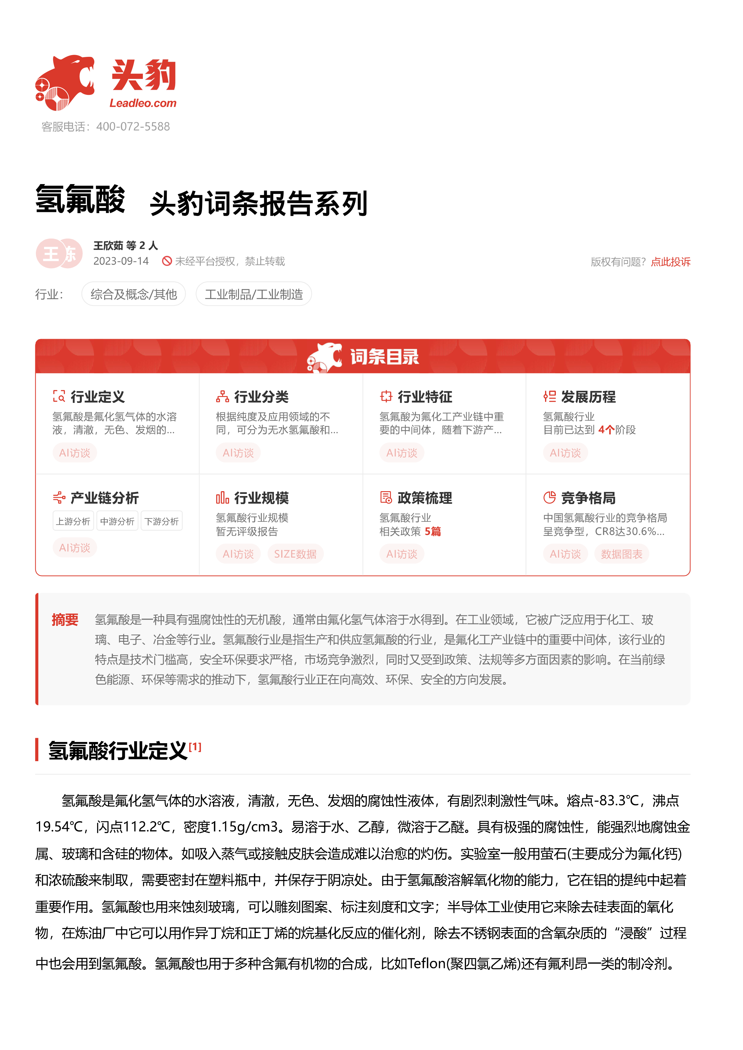 氢氟酸是一种具有强腐蚀性的无机酸,通常由氟化氢气体溶于水得到。在工业领域,它被广泛应用于化工、璃、电子、治金等行业。氢氟酸行业是指生产和供应氢氟酸的行业,是氧化工产业链中的重要中间体,该行业的特点是技术门槛高,安全环保要求严格,市场竞争激烈,同时又受到政策、法规等多方面因素的影响。在当前绿色能源、环保等需求的推动下,三氧酸行业正在向高效安全的方向发展