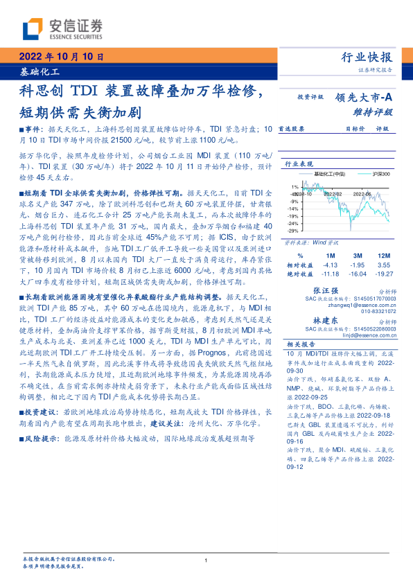 本报告分析了科思创装置故障和万华检修对 TDI 市场的影响,认为短期内全球 TDI 供应紧张,价格弹性可期。长期来看,欧洲能源危机或加速行业产能结构调整,国内 TDI 产能优势将逐步显现。 建议关注沧州大化、万华化学等相关企业。