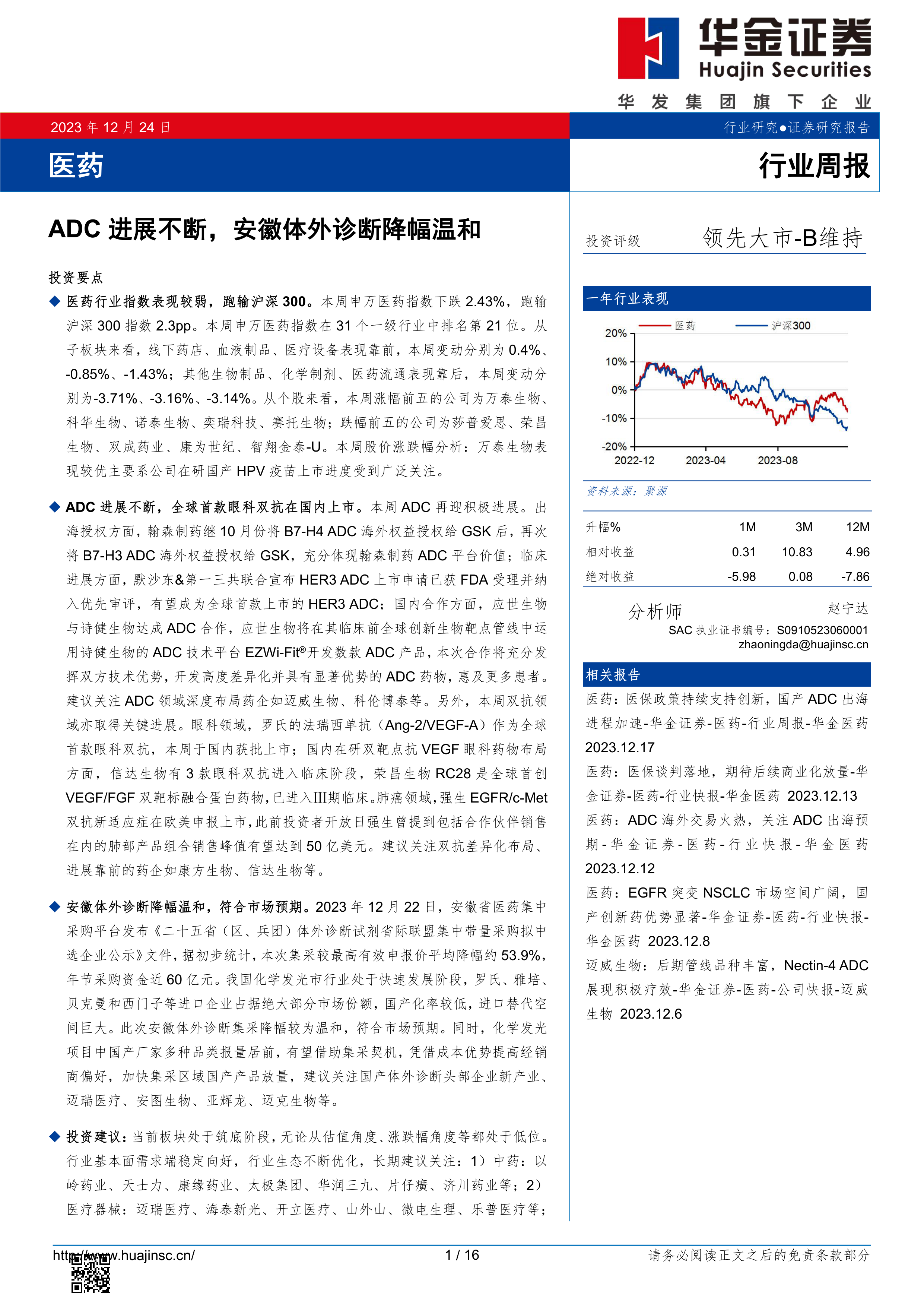 医药行业周报:ADC进展不断,安徽体外诊断降幅温和