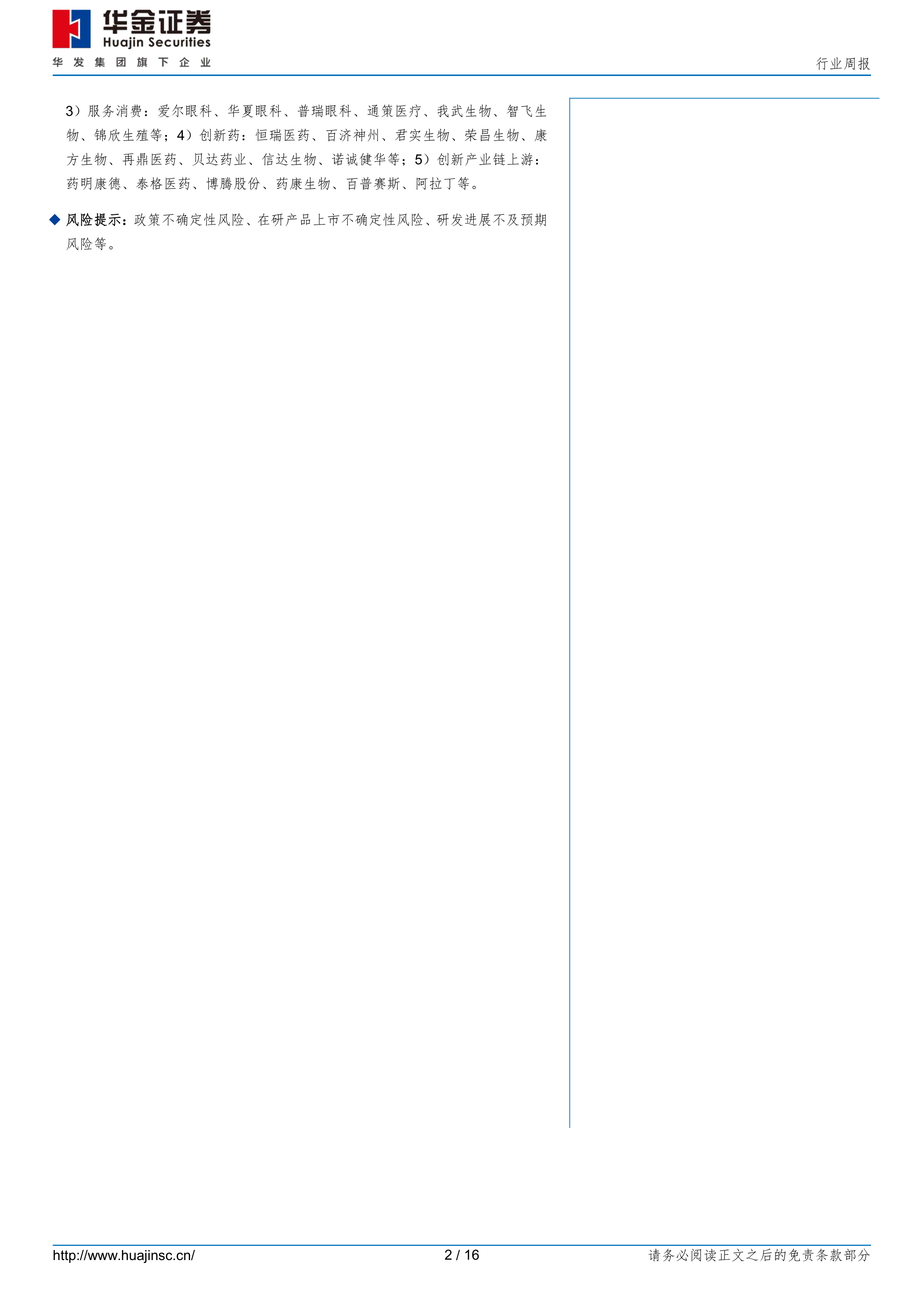 投资建议:当前板块处于筑底阶段,无论从估值角度、涨跌幅角度等都处于低位。行业基本面需求端稳定向好,行业生态不断优化,长期建议关注:1)中药:以岭药业、天士力、康缘药业、太极集团、华润三九、片仔癀、济川药业等;2)医疗器械:迈瑞医疗、海泰新光、开立医疗、山外山、微电生理、乐普医疗等;3)服务消费:爱尔眼科、华夏眼科、普瑞眼科、通策医疗、我武生物、智飞生物、锦欣生殖等;4)创新药:恒瑞医药、百济神州、君实生物、荣昌生物、康方生物、再鼎医药、贝达药业、信达生物、诺诚健华等;5)创新产业链上游:药明康德、泰格医药、博腾股份、药康生物、百普赛斯、阿拉丁等。