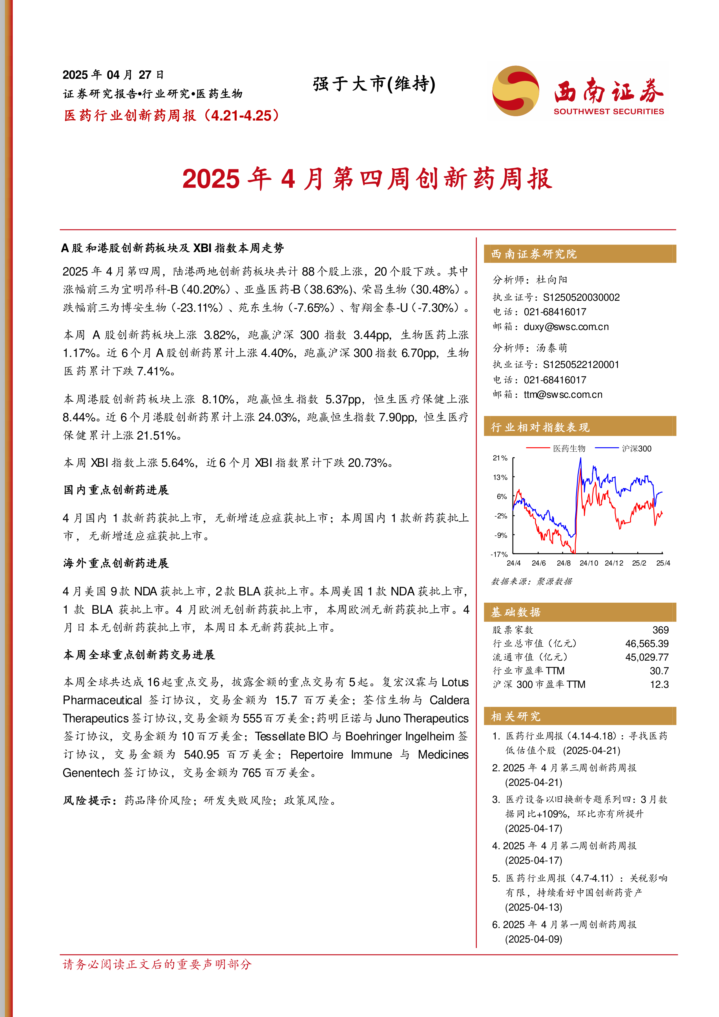 2025年4月第四周,陆港两地创新药板块共计88个股上涨,20个股下跌。其中涨幅前三为宜明昂科-B(40.20%)、亚盛医药-B(38.63%)、荣昌生物(30.48%)。跌幅前三为博安生物(-23.11%)、苑东生物(-7.65%)、智翔金泰-U(-7.30%)。